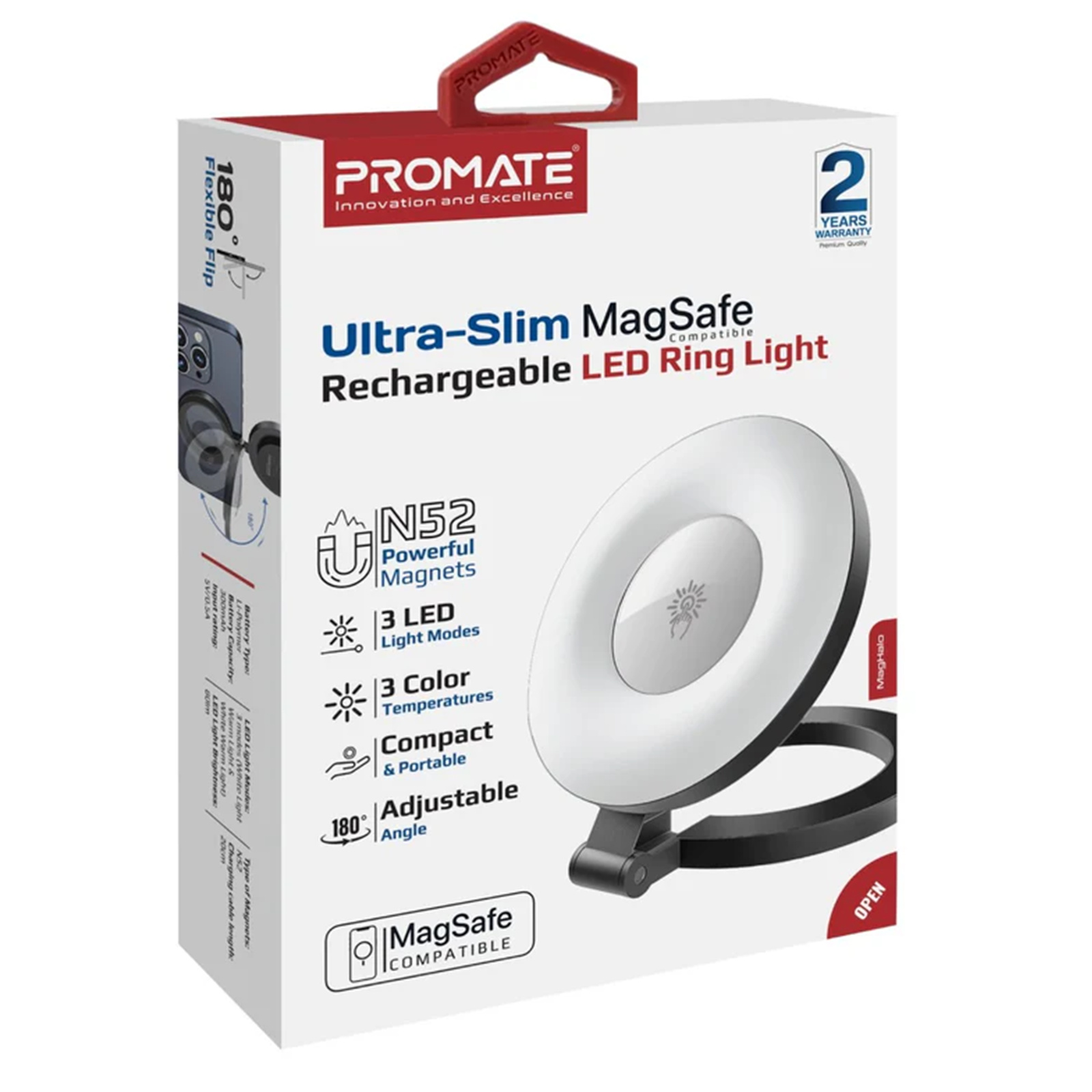 Introducing Promate's MagHalo, a game-changer in mobile lighting. Designed for photographers and videographers, this ultra-slim, lightweight LED light integrates seamlessly with MagSafe technology, attaching effortlessly to your phone. Its 180° flip capability ensures perfect positioning for selfies and portraits. With three lighting modes-White, Warm, and Natural-the MagHalo provides ideal lighting for any scenario. Engineered with a strong N52 magnet and a high-capacity 300mAh Li-Polymer battery, it offers excellent battery life and reliability. Whether used with a smartphone or selfie stick, the MagHalo delivers unmatched versatility and performance. Plus, the included 20cm charging cable makes staying powered up convenient. Elevate your photography and illuminate your creativity with the MagHalo-where innovation meets perfection.
