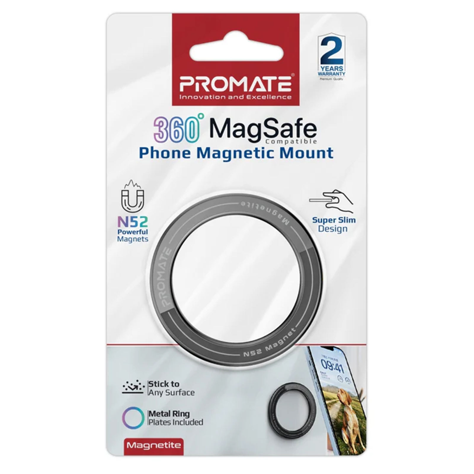 Promate MAGNETITE 360 Degrees MagSafe Compatible Phone Magnetic Mount - Black Secure Cradless Design, SuperSlim Design, Metal Ring Included, Sticks to Any Surface