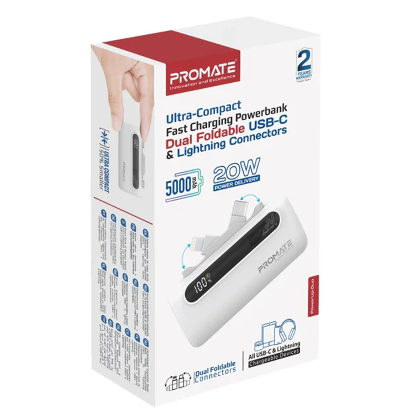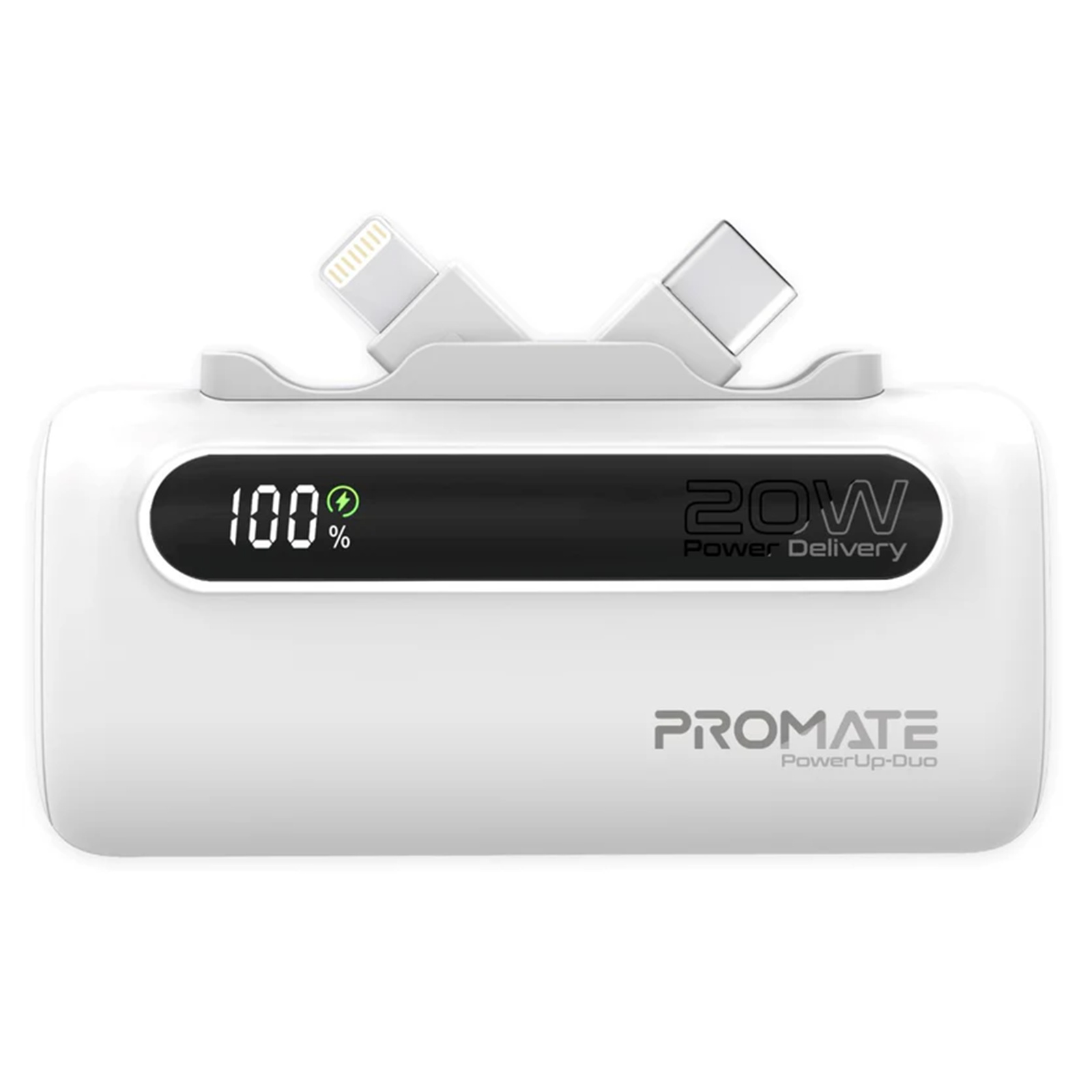 Introducing the PowerUp-Duo, the ultimate portable power source that fits in the palm of your hand. With a robust 5000mAh battery capacity, this mini power bank ensures your devices stay charged on the go. Featuring dual built-in USB-C™ in/out and Lightning output foldable connectors, it effortlessly supports both rapid charging and dual connectivity. The 20W USB-C™ port offers versatile in/out functionality, while advanced over-charging and overheating protection keep your devices safe. Designed with convenience in mind, the sleek, pocket-sized PowerUp-Duo also boasts an LED display for real-time power level monitoring, making it the perfect companion for your dynamic lifestyle.