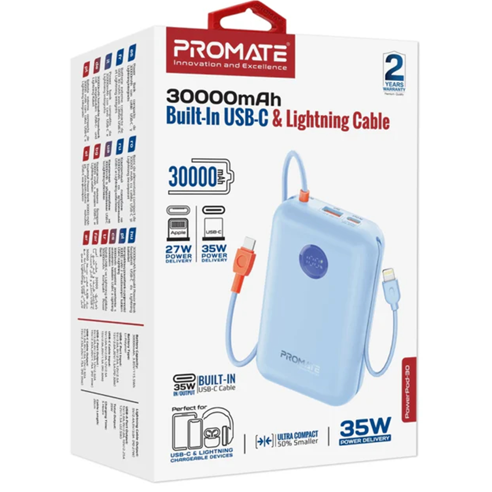 Forget the hassle of carrying extra cables as PowerPod-30 features convenient built-in USB-C Power Delivery and Lightning Connector cables.