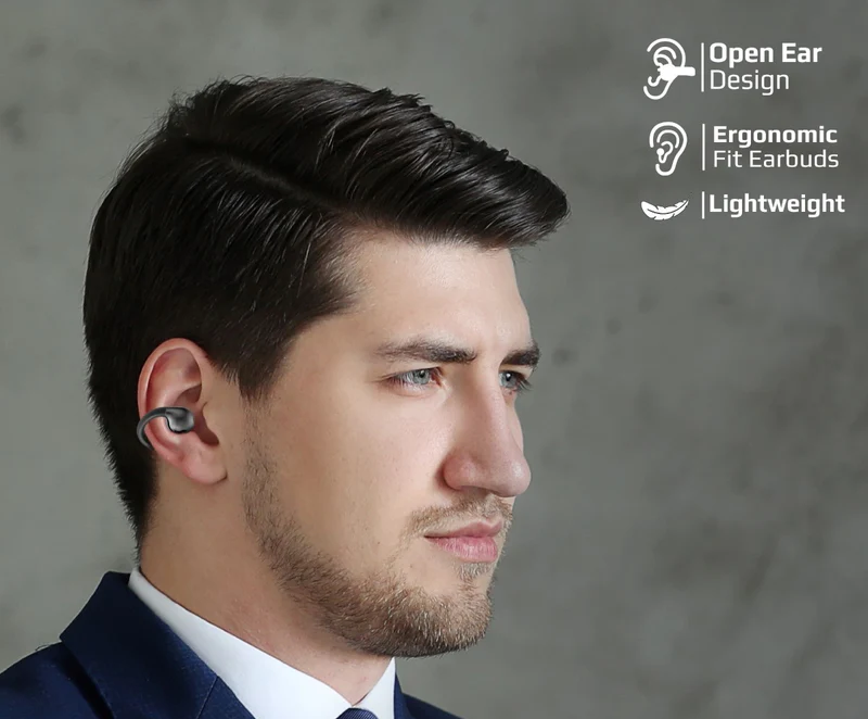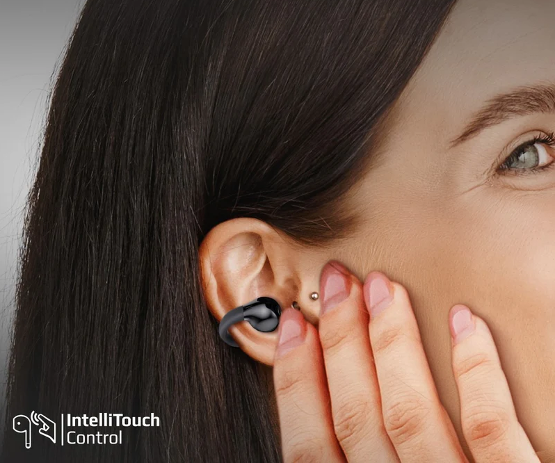Experience audio like never before with AirClip, the revolutionary clip-on OWS (Open Wearable Stereo) True Wireless Earbuds that combine amazing audio, superior comfort and enhanced environmental awareness. The lightweight, open-ear design with AudioFit™ technology maximizes comfort and reduces ear duress, without compromising on audio quality, while IntelliTouch Control provides effortless music and call handling. Make Crystal Clear Calls and enjoy Superior Sound Quality with True Wireless Stereo and up to 28 hours of music playtime. Its IPX4 water-resistance and extended battery life mean you can take your music anywhere, no matter the conditions. Discover the freedom of OWS True Wireless Earbuds with AirClip.
