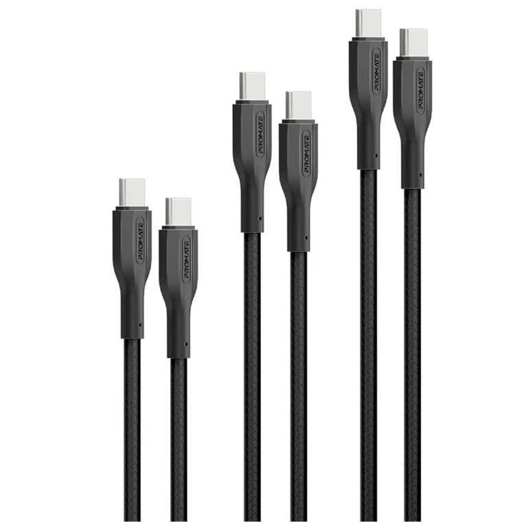 Promate CABLEKIT-CC 3-Piece 60W PW USB-CCable Kit. Includes 0.3M, 1.2M & 2M Lenghts. Data & Charge, Supports 5A/20V. Black