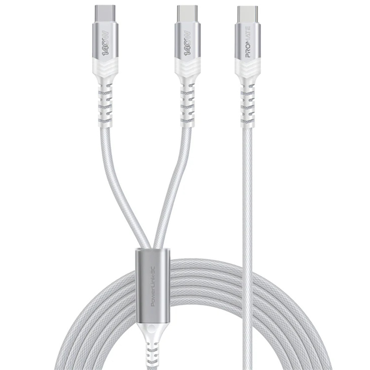 Promate POWERLINK-3C-WHT 1.4M 140W PD USB-C to Dual USB-C Charging Cable - White