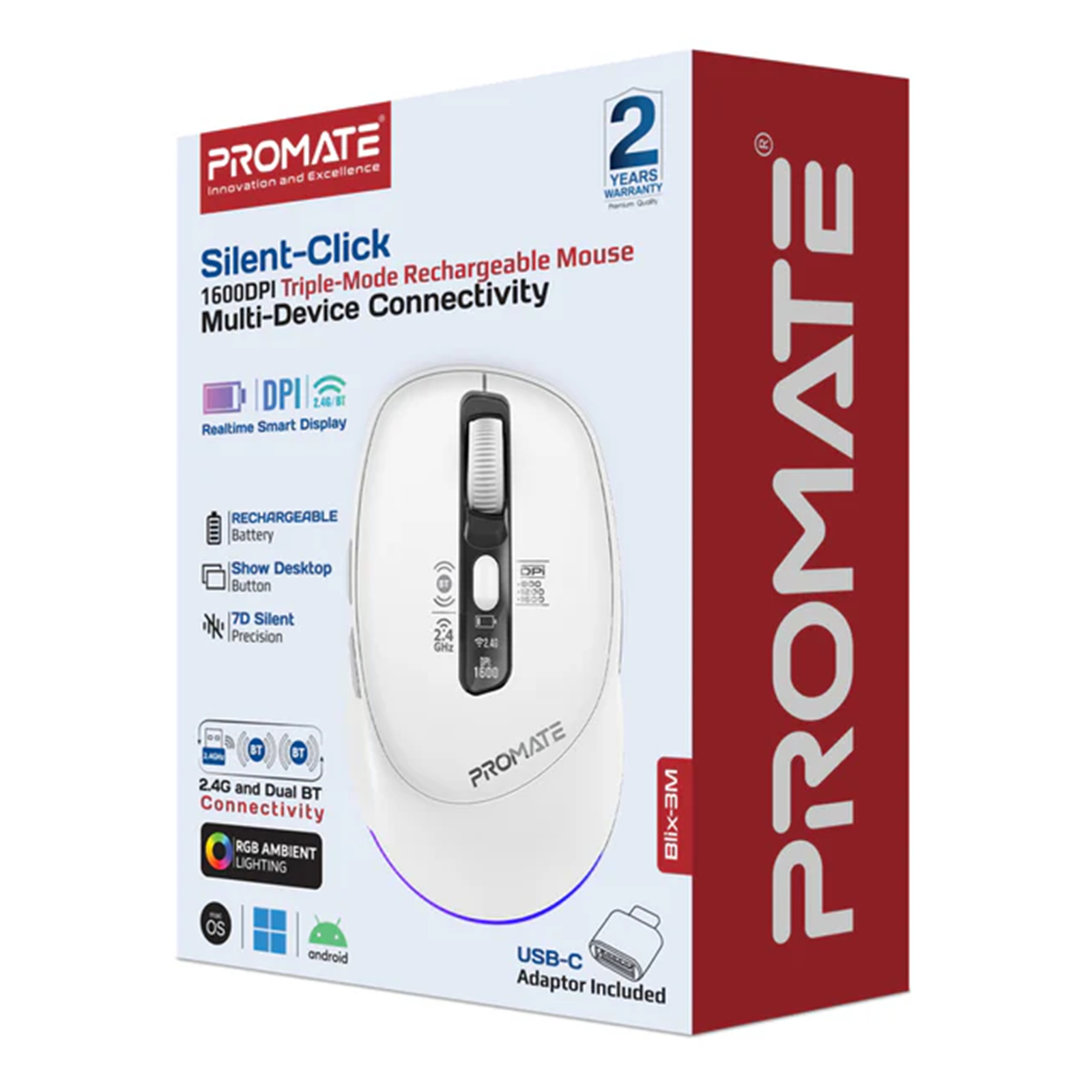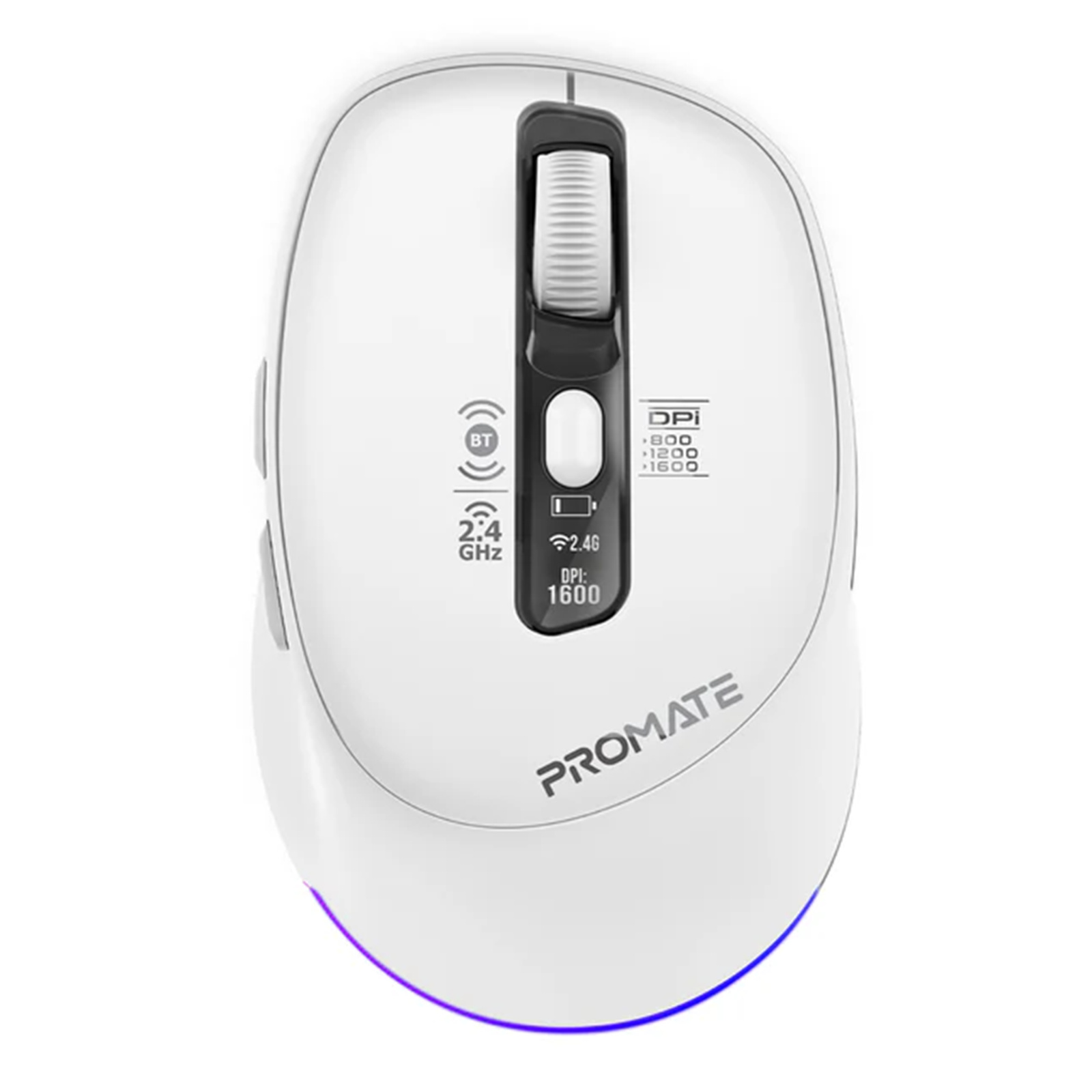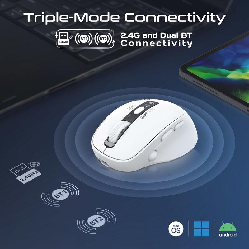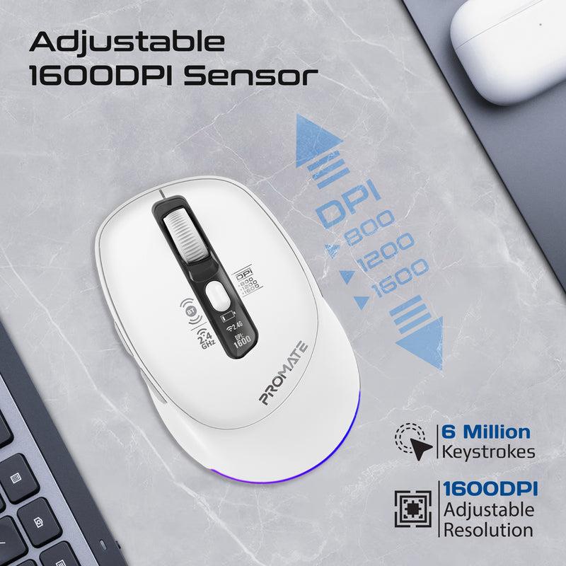 Promate BLIX-3M-WHT Tri-Connect Wireless Mouse with Rechargeable Battery. 2.4G & BT Connect