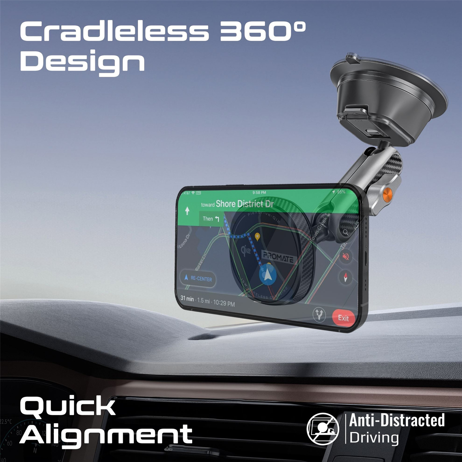 Promate FLEXDRIVE-QI2 FlexiGrip 15W MagSafe Qi2 Wireless Charger with Flexible Dual Ball Jointsfor Better Viewing Angles, Windshield or Dashmount, Cradleless 360 Design.