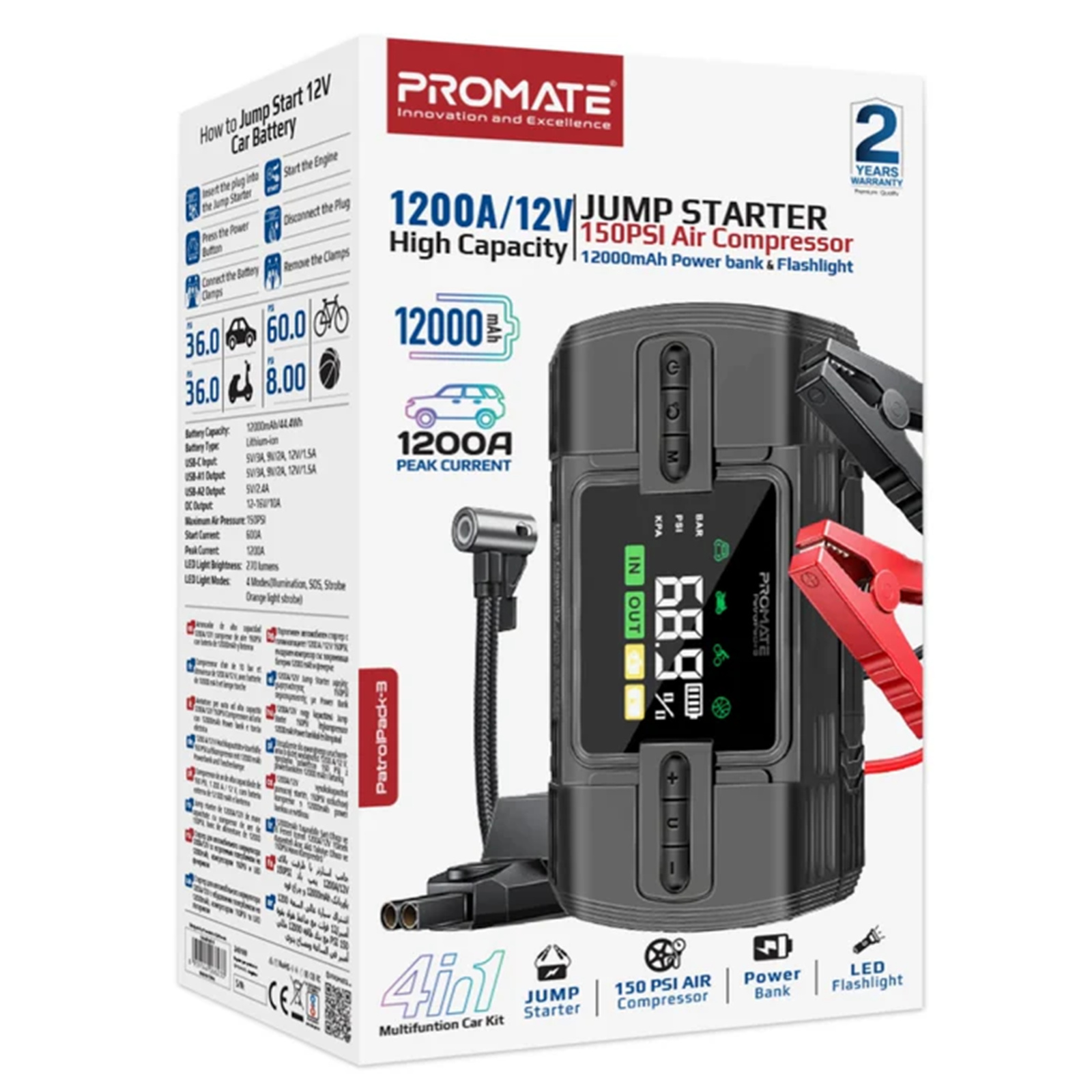 Introducing the PatrolPack-3 by Promate, the ultimate solution for all your roadside emergencies. This rugged 4-in-1 jump starter is packed with features to keep you and your vehicle prepared on the go. With a peak current of 1200A/12V, it can jump-start your vehicle effortlessly, while reverse polarity protection ensures safe operation every time. Need to inflate your tires? No problem. The built-in 150PSI air compressor has got you covered. Plus, with a massive 12000mAh battery capacity, you can power up your mobile devices multiple times over. Stay informed with the automatic TPMS (Tire Pressure Monitoring System) function and the big LED screen displaying crucial information. With dual USB-A ports, including one with QC 3.0, and a 160W DC output, you can charge your devices at lightning speed. Don't forget the 4-mode LED flashlight for added convenience. Get ready to hit the road with confidence with the PatrolPack-3.