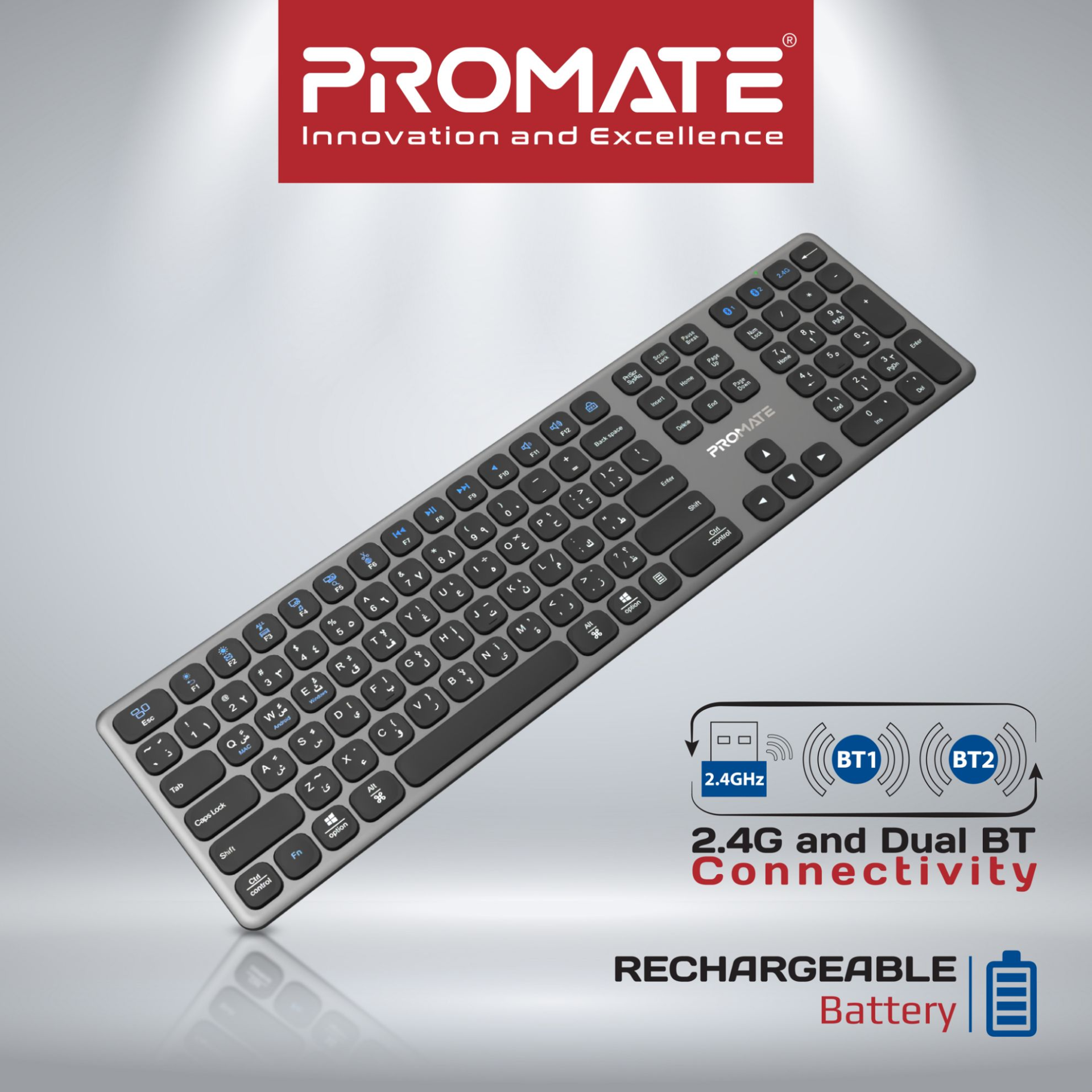 Product URL: https://www.pbtech.co.nz/product/PRM7475/Promate-PROKEYS-XS-Full-Size-Triple-Mode-Wireless