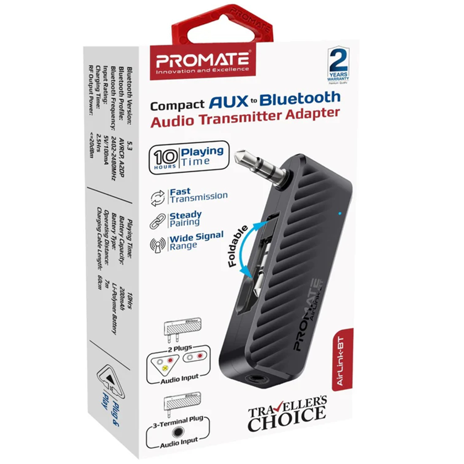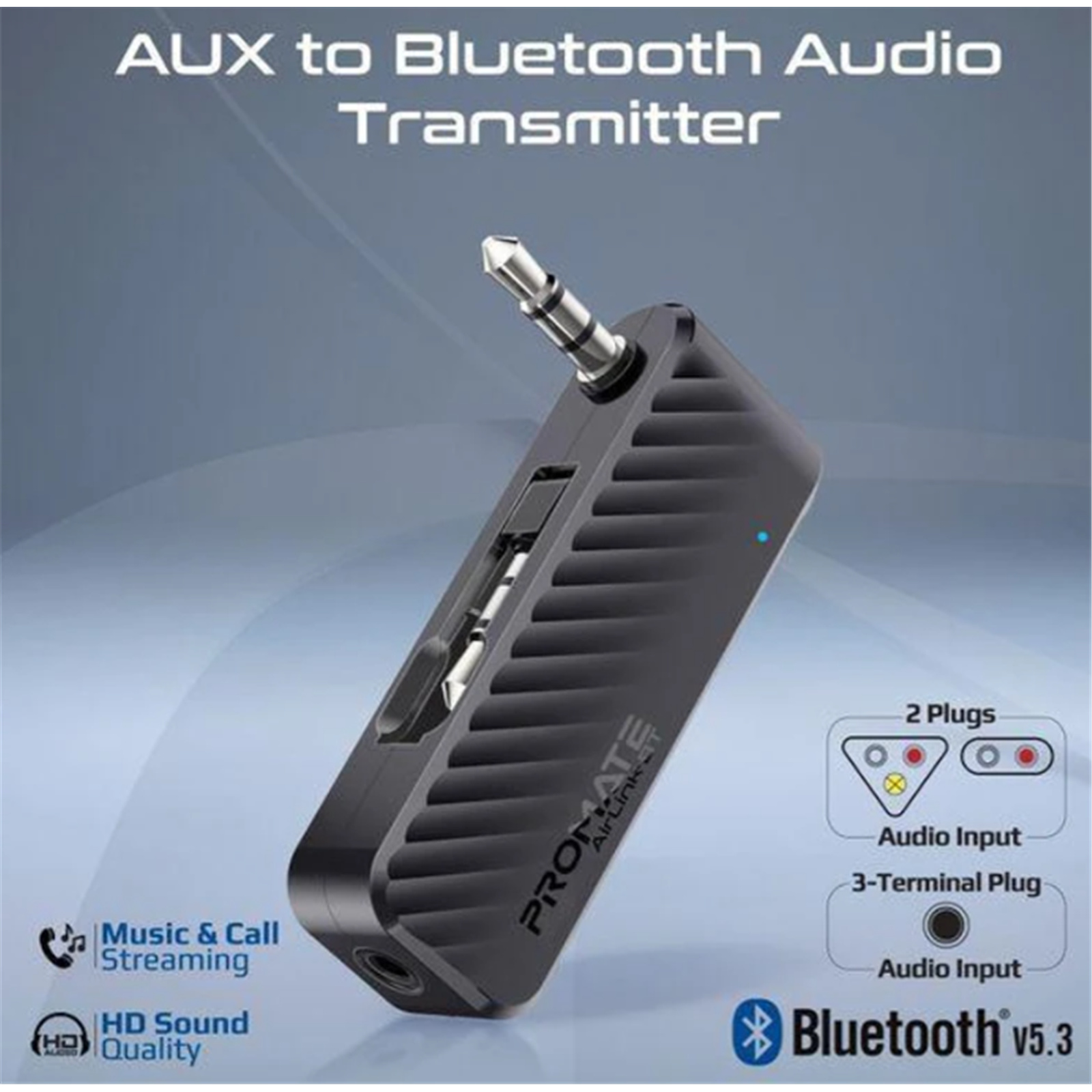 Unlock a new realm of wireless audio with Promate's AirLink-BT, a cutting-edge AUX to Bluetooth audio transmitter. With advanced Bluetooth V5.3 technology, this sleek and compact device seamlessly converts the non-Bluetooth AUX audio output of your TV, fitness machine, gaming console and in-flight entertainment system into high-quality Blue-tooth audio, allowing you to connect and listen on your favourite Bluetooth headphones or speakers. Enjoy up to 10 hours of uninterrupted playtime on a single charge, thanks to its powerful 200mAh battery. Perfect for travellers and tech enthusiasts, the AirLink-BT delivers unparalleled wireless audio performance, combining portability with exceptional functionality.