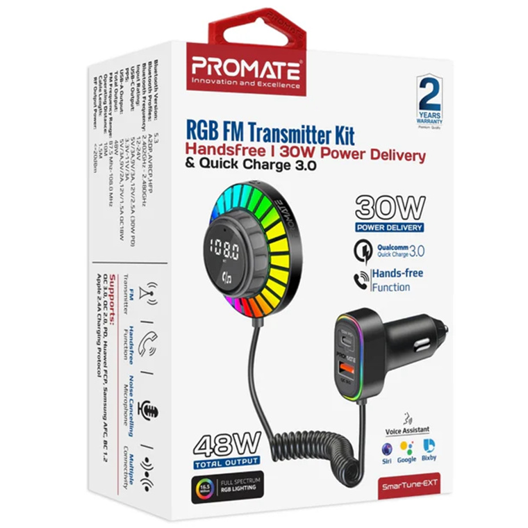 Promate SMARTUNE-EXT RGB FM Transmitter with Handsfree & 30W PD & QC3.0 Ports Includes 1.5m Extenstion Cord, Sound Activated RGB Lights, 48W Total Output, FM Range 87.5-108 Mhz, Operating Distance 10m.