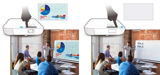 Slide the lens shutter closed at any time and the projector will go into A/V mute (sleep mode) so you can stop and start your presentations when needed.