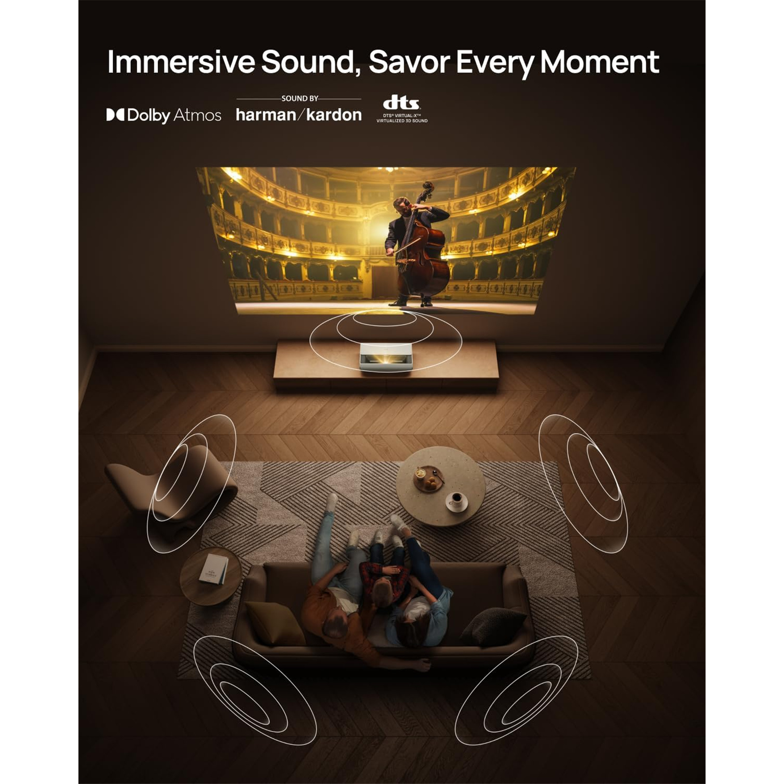 Enjoy a truly cinematic audio experience with built-in 60W Harman Kardon speakers enhanced by Dolby Atmos® technology. AURA 2 delivers clear speech, crisp highs, and booming lows, eliminating the need for additional audio equipment.