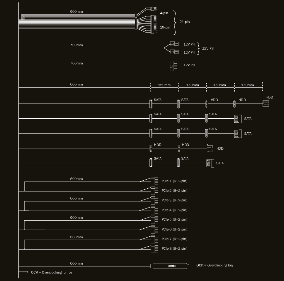 - Overclocking key switches between four 12V rails and one massive 12V rail
