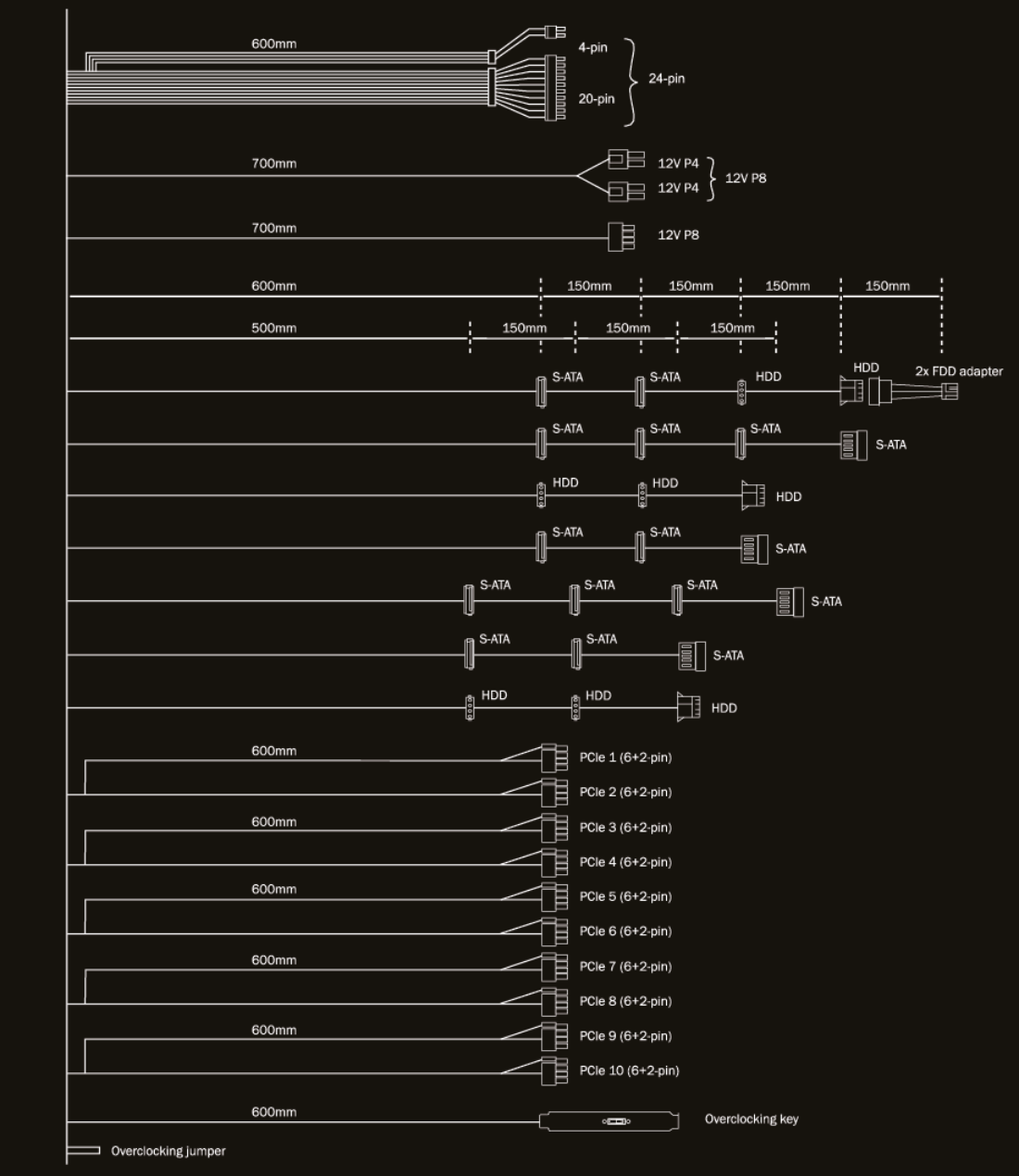 - Overclocking key switches between six 12V rails and one massive 12V rail