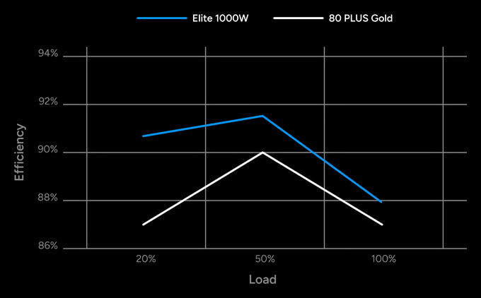 Cooler Master Elite Gold 1000 achieves over 90% efficiency at typical loads, helping reduce energy waste and minimize heat generation.