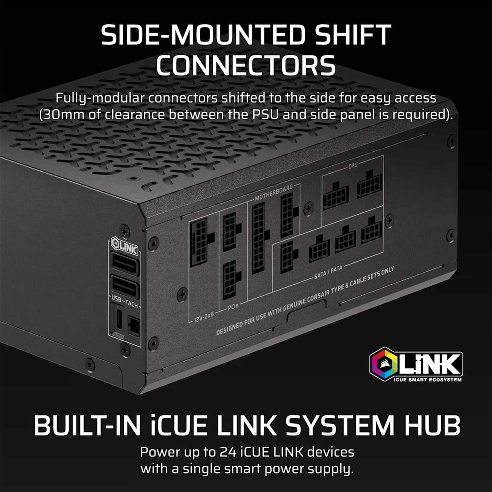 The first CORSAIR power supply to feature an iCUE LINK System Hub to give you control of up to 24 iCUE LINK devices for next-level cooling and lighting customization.