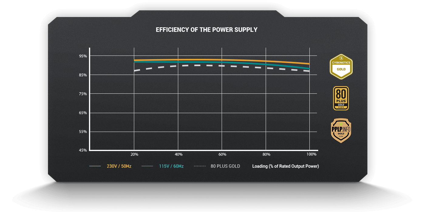 80 Plus Gold certified to meet a 92% high level of power efficiency under typical loads of 50%, while Cybenetics and PPLP also rates each PG1200G unit as Gold as well.