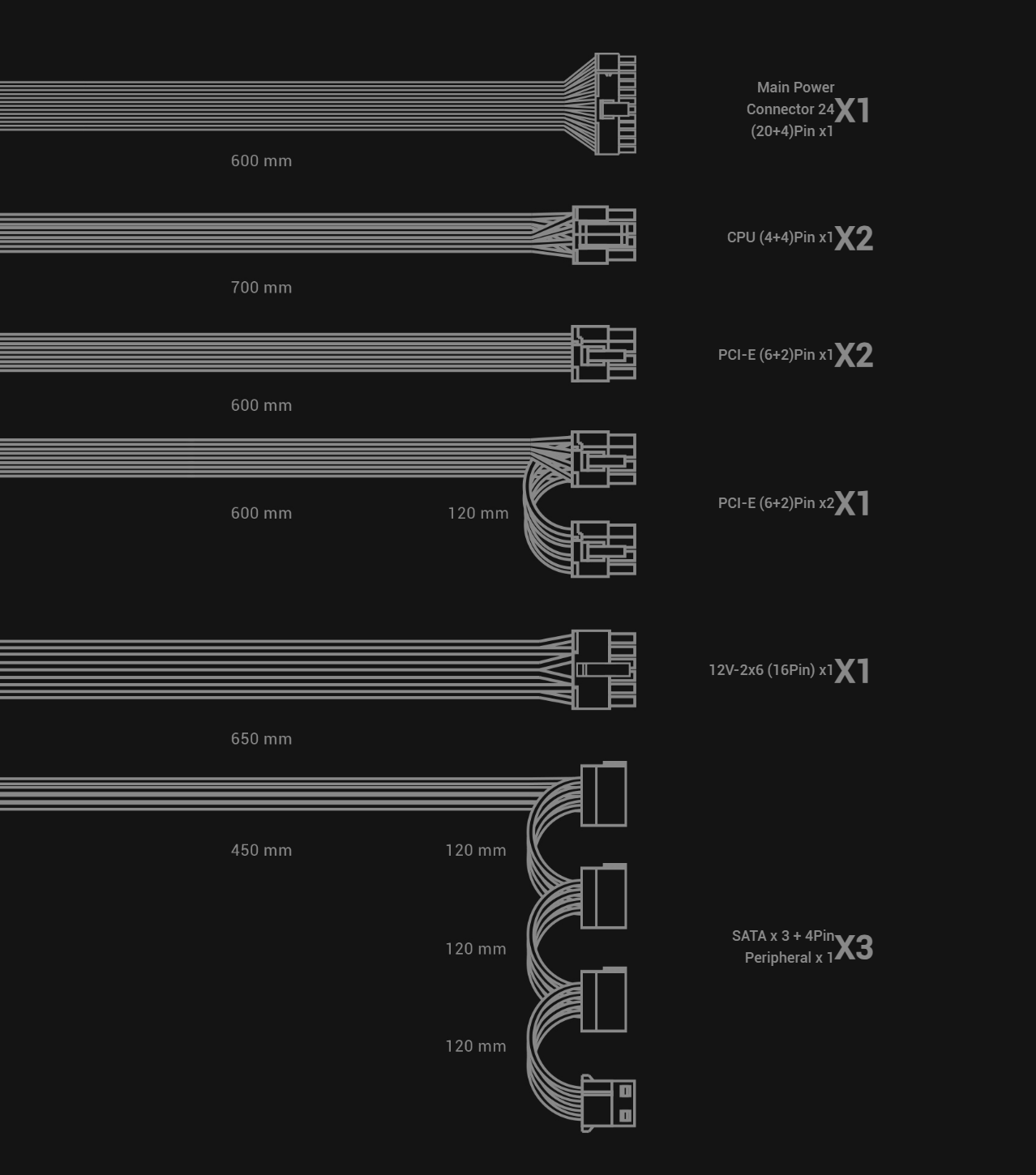 Equipped with a high-grade sleeved 105C-resistant 16AWG copper-core 12V-2x6 cable, the PQ1200G provides up to 600W for modern GPUs.