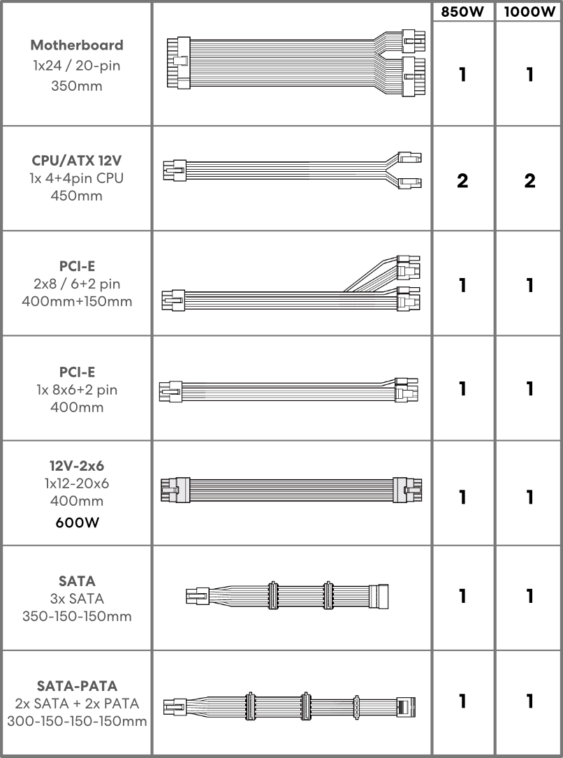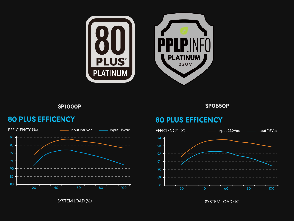 Equipped with a 12V-2x6 (600 W) cable, dual EPS 4+4, PCIe 6+2, as well as SATA and PATA connectors, the SP Platinum Series is ready for any high-performance build. Active PFC (PF>0.95) ensures efficient and stable power delivery across all platforms.