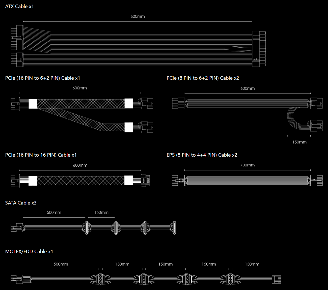 All of the power supply's cables are flat and in black. The flat cables make cable management easier and less of headache! Thanks to the flat cables, the entire system can be more organized and has more room for unobstructed airflow. Use the cables you need, and store the rest in the included cable bag.