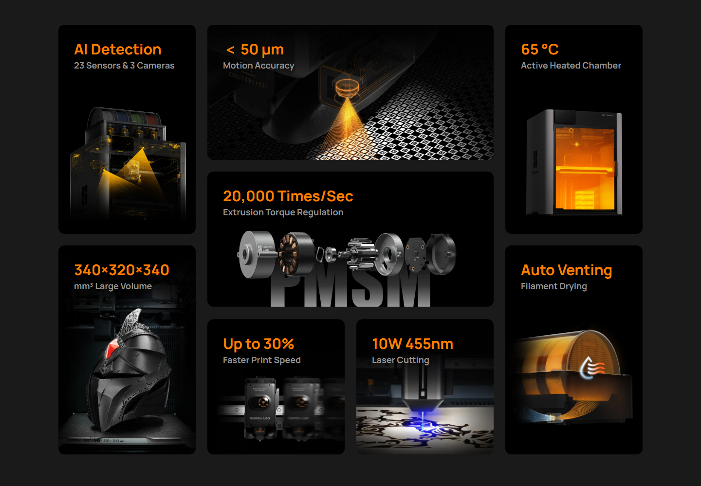 Bambu Lab H2SL Full Combo with 10W Laser and Cutting Module, Build Size 340 x 320 x 340mm - Automatic Material System - Multi-Colors / Materials Capability - Up to 16 Multi-Color Printing