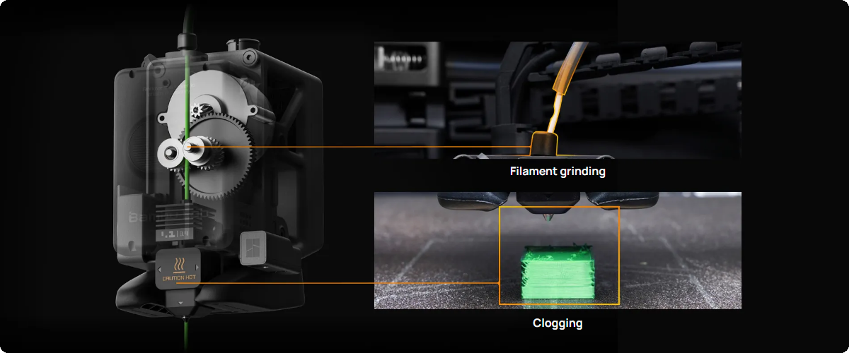 Bambu Lab's proprietary PMSM servo system enables 20 kHz resistance and position sampling to dynamically modulate electromagnetic torque vectors. It stabilizes extrusion and actively detects grinding⁽³⁾ or clogs in real time.