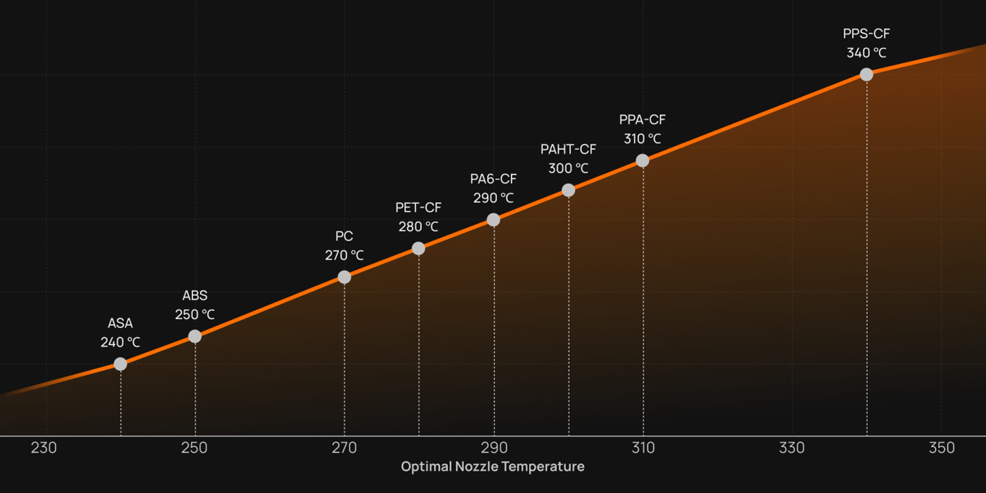 Unlock the full potential of your high-temperature engineering filaments with a 350℃ (662°F) nozzle. Experience improved layer bonding when printing demanding materials like PPA-CF, PPS, and PPS-CF at higher temperatures, leading to stronger and more reliable parts.