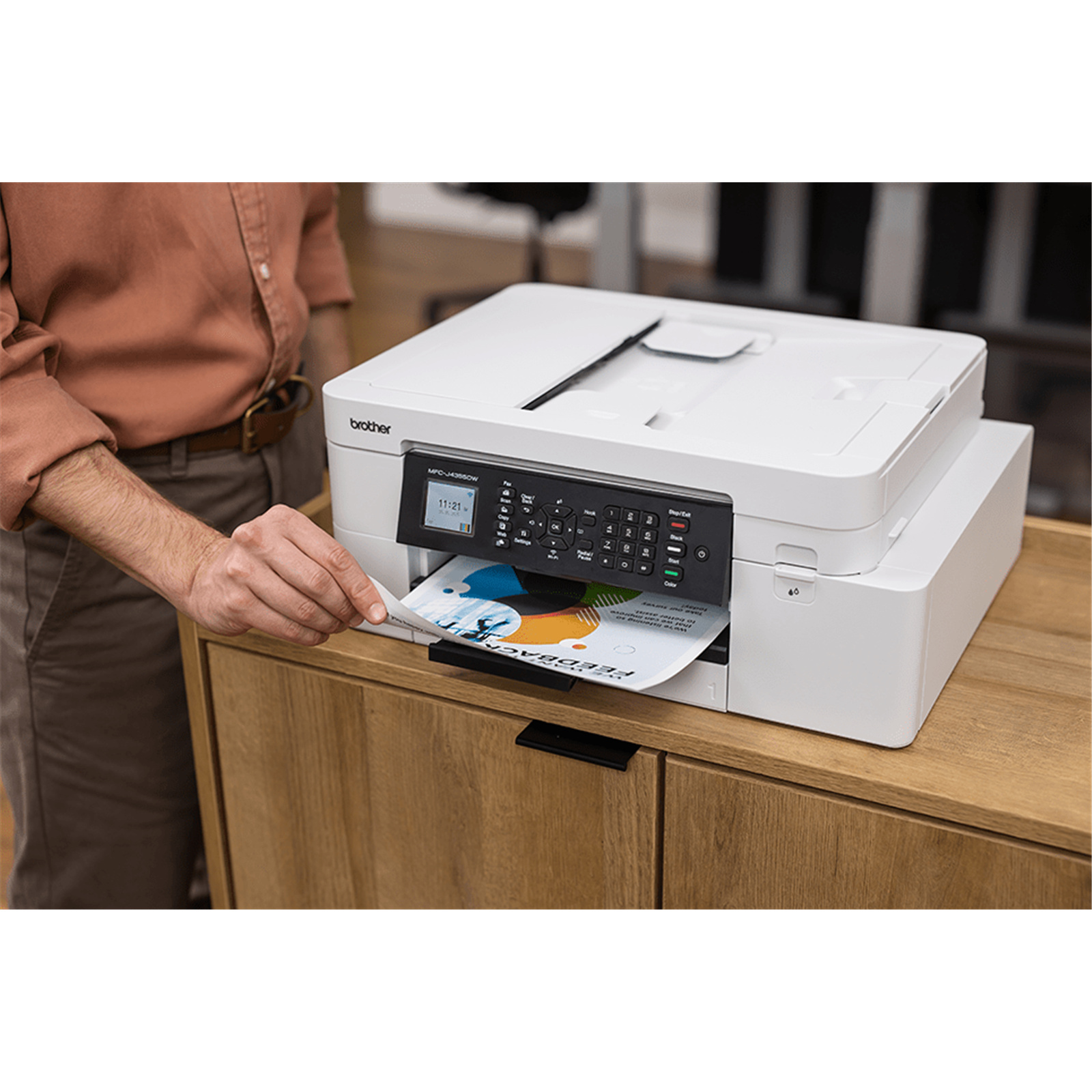 The stylish MFC-J4355DW is a business-quality multifunction device offering A4 print, copy, scan, and fax functionality.
