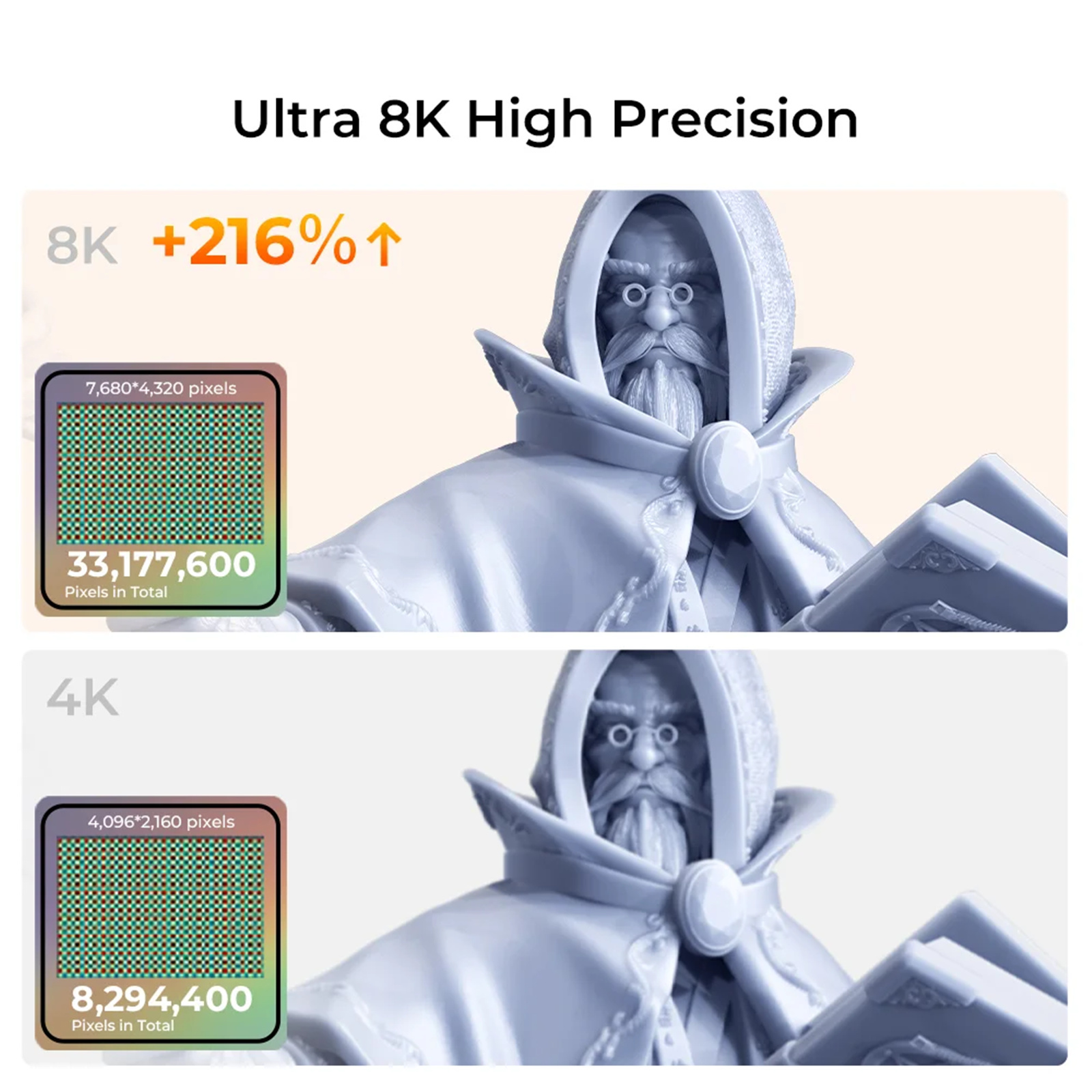 HALOT-MAGE PRO uses an 8K(7680x4320) mono LCD featuring 29.7µm XY resolution, more refined and anti-aliasing than the 50µm of a regular 4K printer.