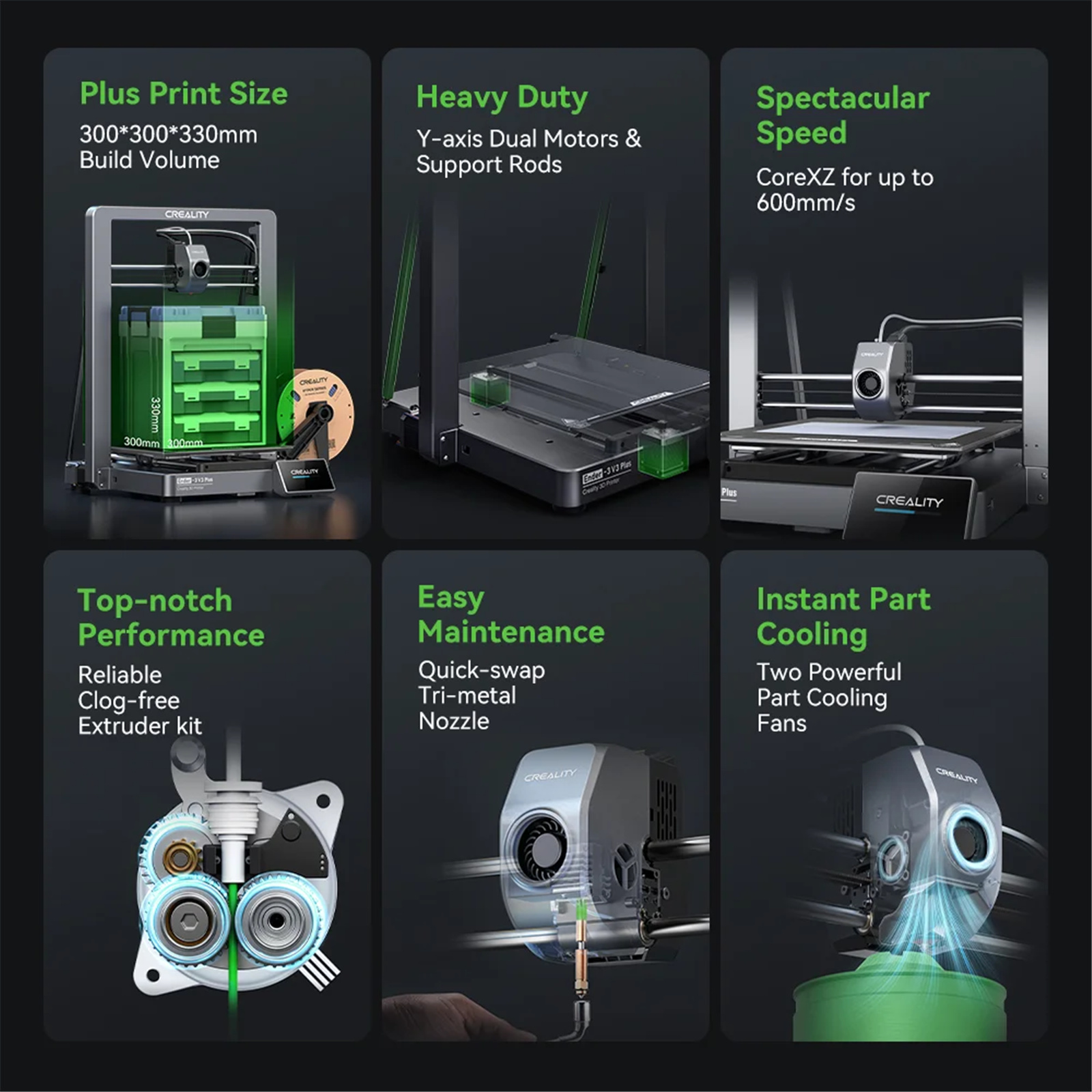 Typical Printing Speed 300mm/s - Up to 600mm/S - Build Size 300 x 300 x 330mm - New High-Speed Direct Drive Extruder - Quick-Swap Nozzle - Touch Screen - WiFi