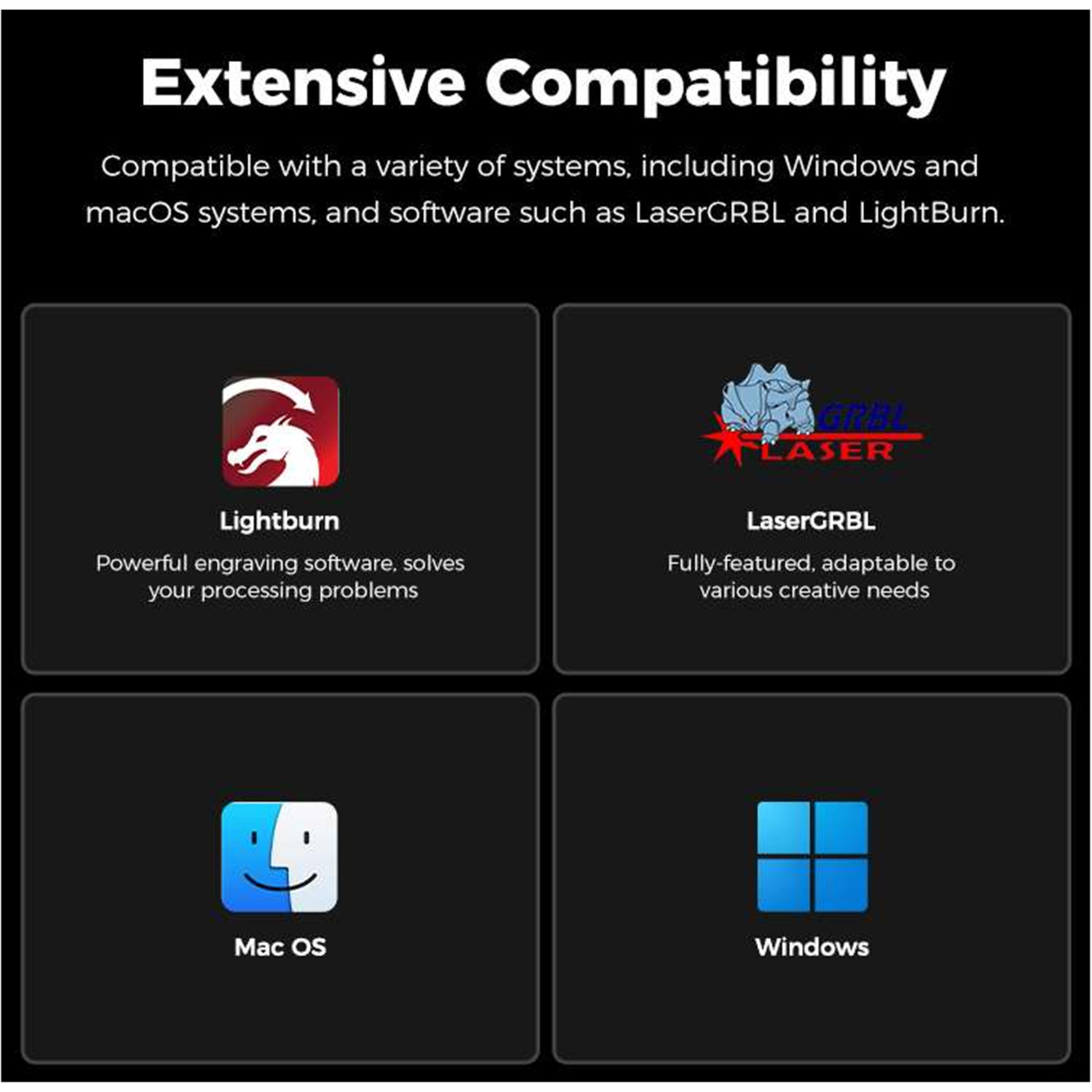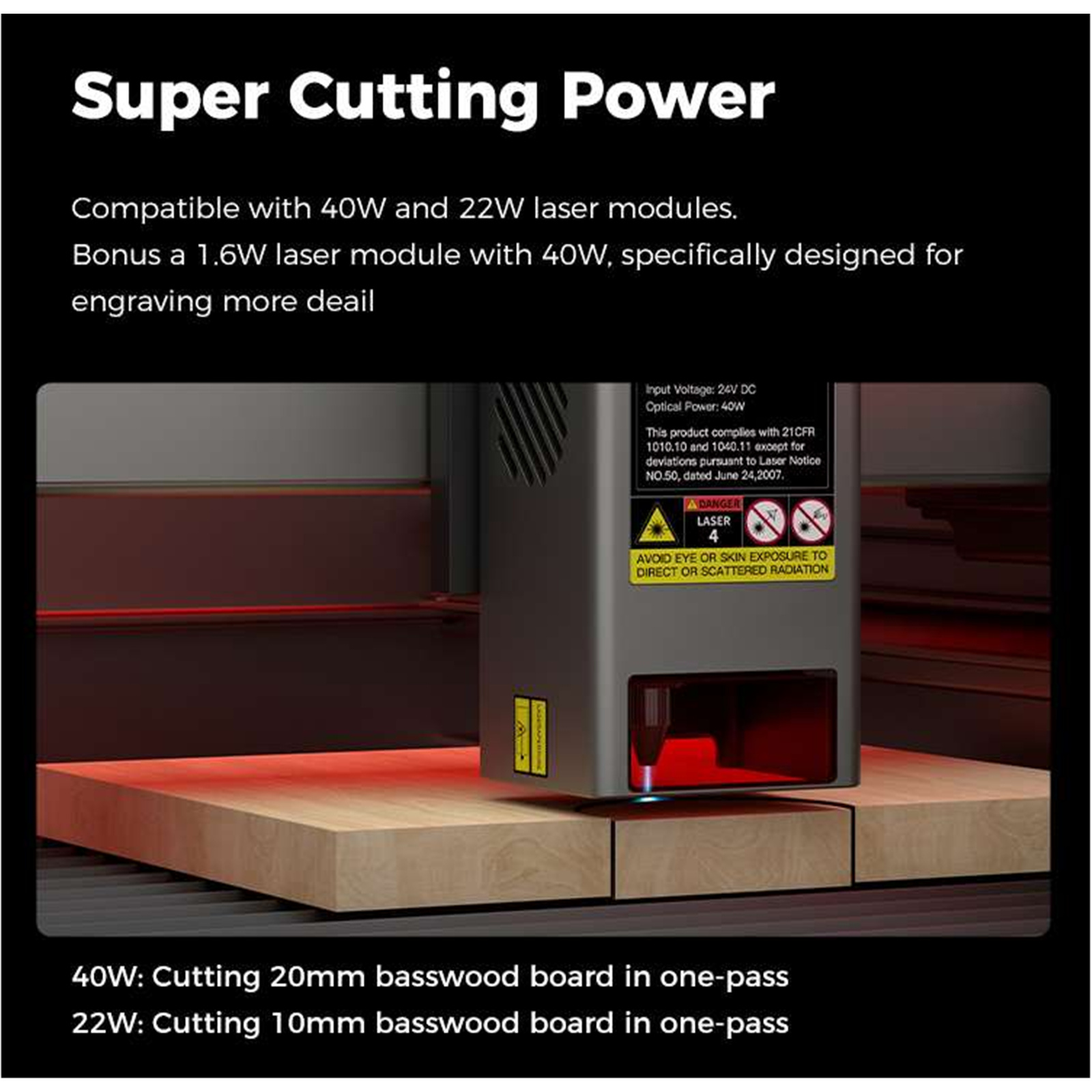 Compatible with 40W and 22W laser modules. Bonus a1.6W laser module with 40W, specifically designed for engraving more detail.