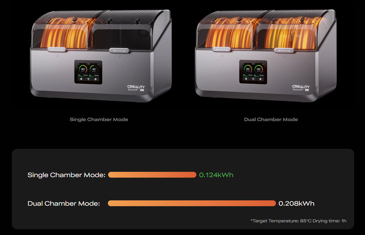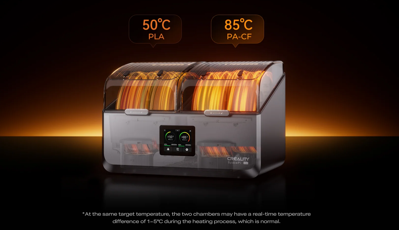 Each chamber is equipped with an independent PTC heater, allowing simultaneous drying of two filament types at different temperatures in one machine.