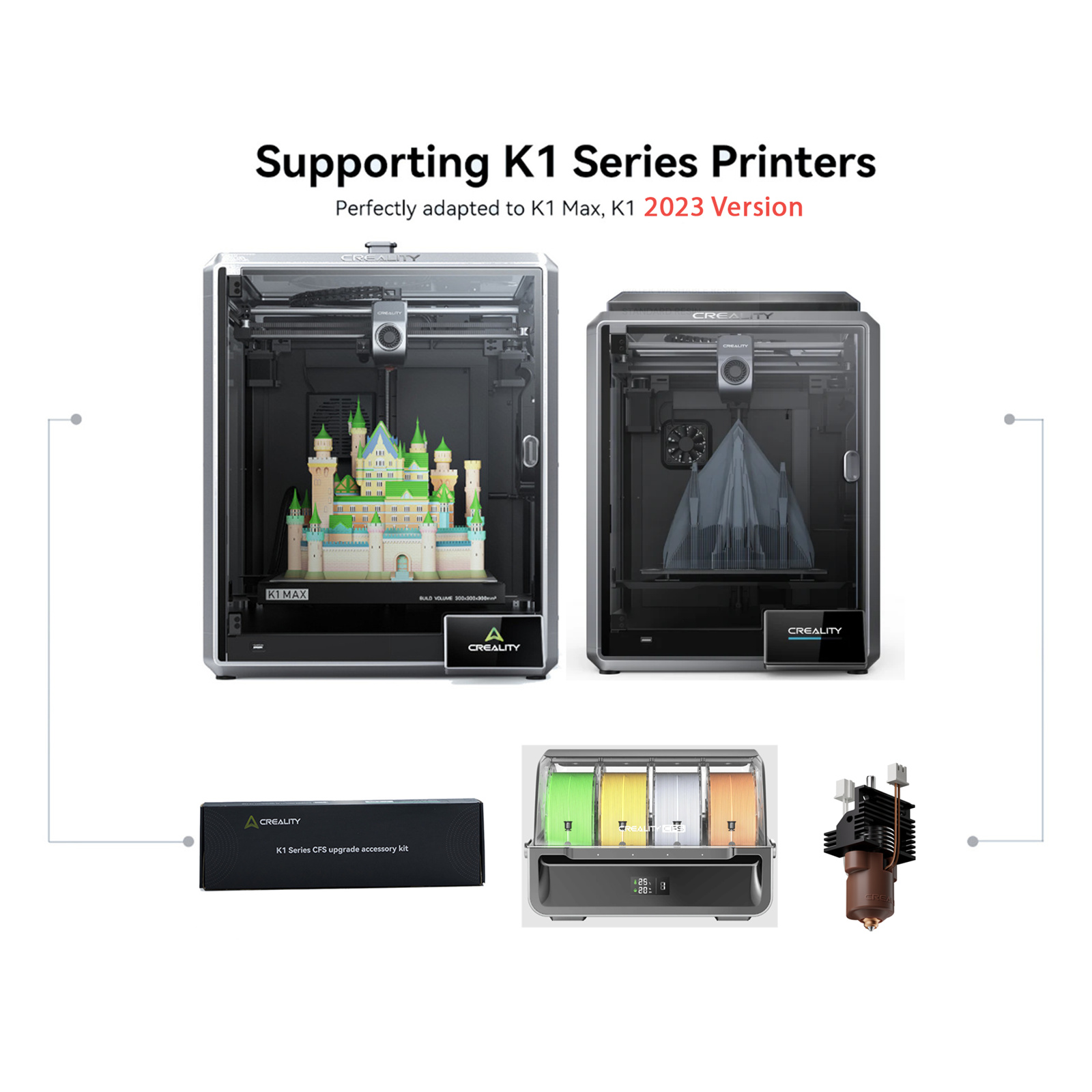 NOTE: The bundle pack includes upgrade kit, CFS, Quick-swap Nozzle Kit. It ONLY supports K1, K1 Max which produced by 31/12/2023.