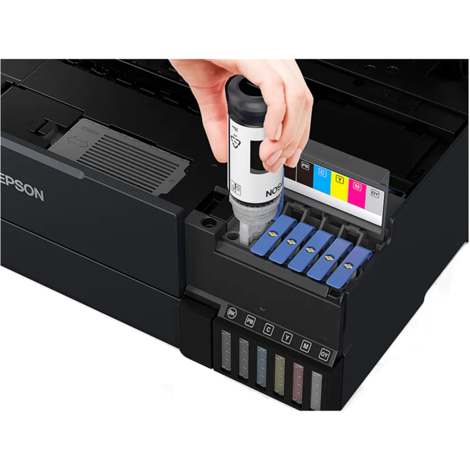 Additional low-cost ink can be bought in convenient high-volume bottles that have a drip-free nozzle and resealable cap for easy storage and refilling. We have redesigned our ink bottles to incorporate a unique key system. Each bottle is keyed so that it only fits into the corresponding ink tank on the printer, thus preventing mis-filling or spillage. Replacement bottles hold enough ink for a massive 6,700 pages in black1 / 6,200 pages in colour1