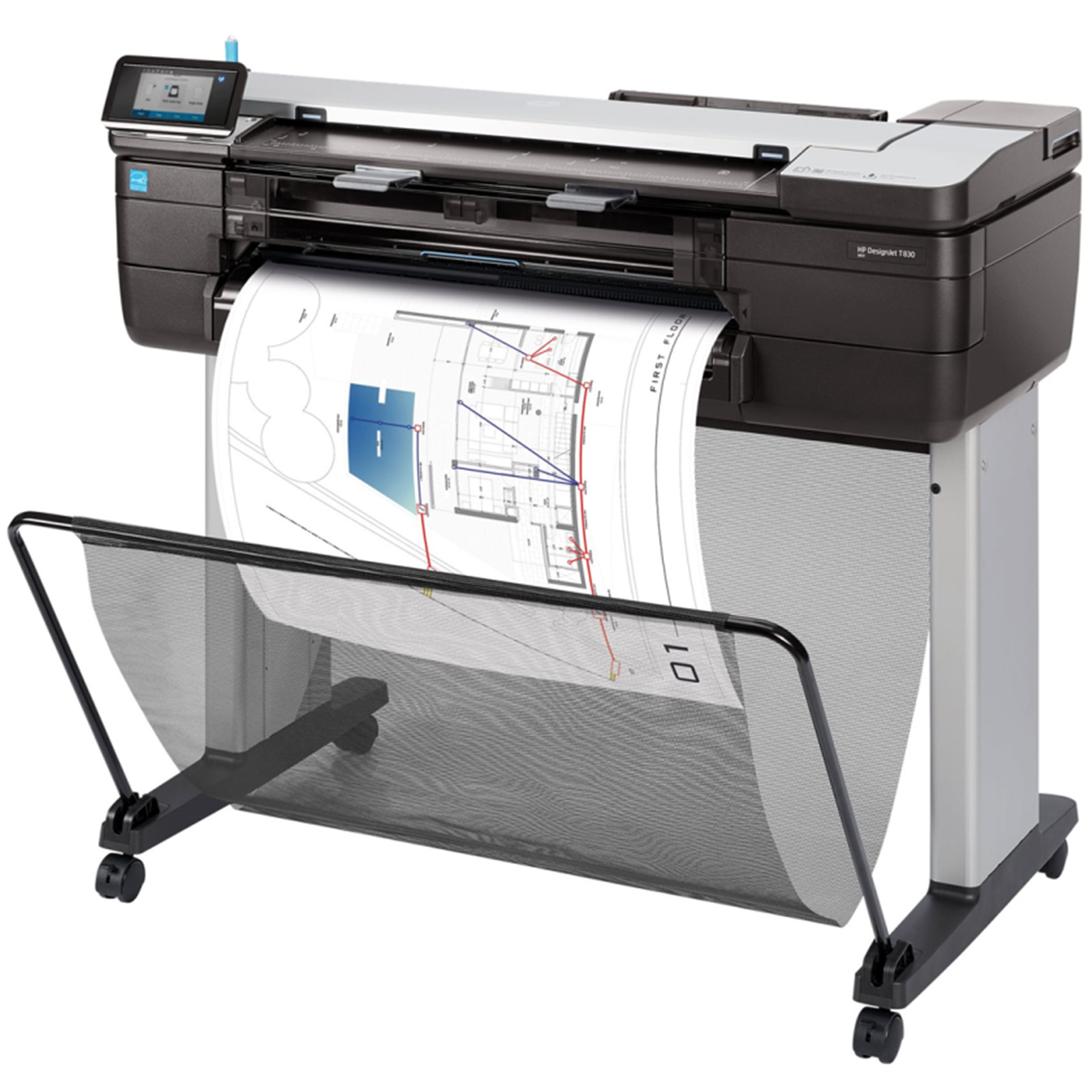 HP DesignJet T830 24-in MFP, printhead, ink cartridges, printer stand, spindle, quick reference guide, setup poster, startup software, power cord, refeed preventers