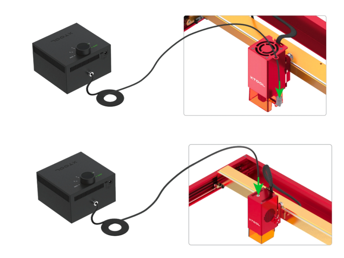 1, connect to D1 Pro laser module from the smart air assist by the tube, the way of connection on laser module side is based on the laser module model. please check the photo below.
