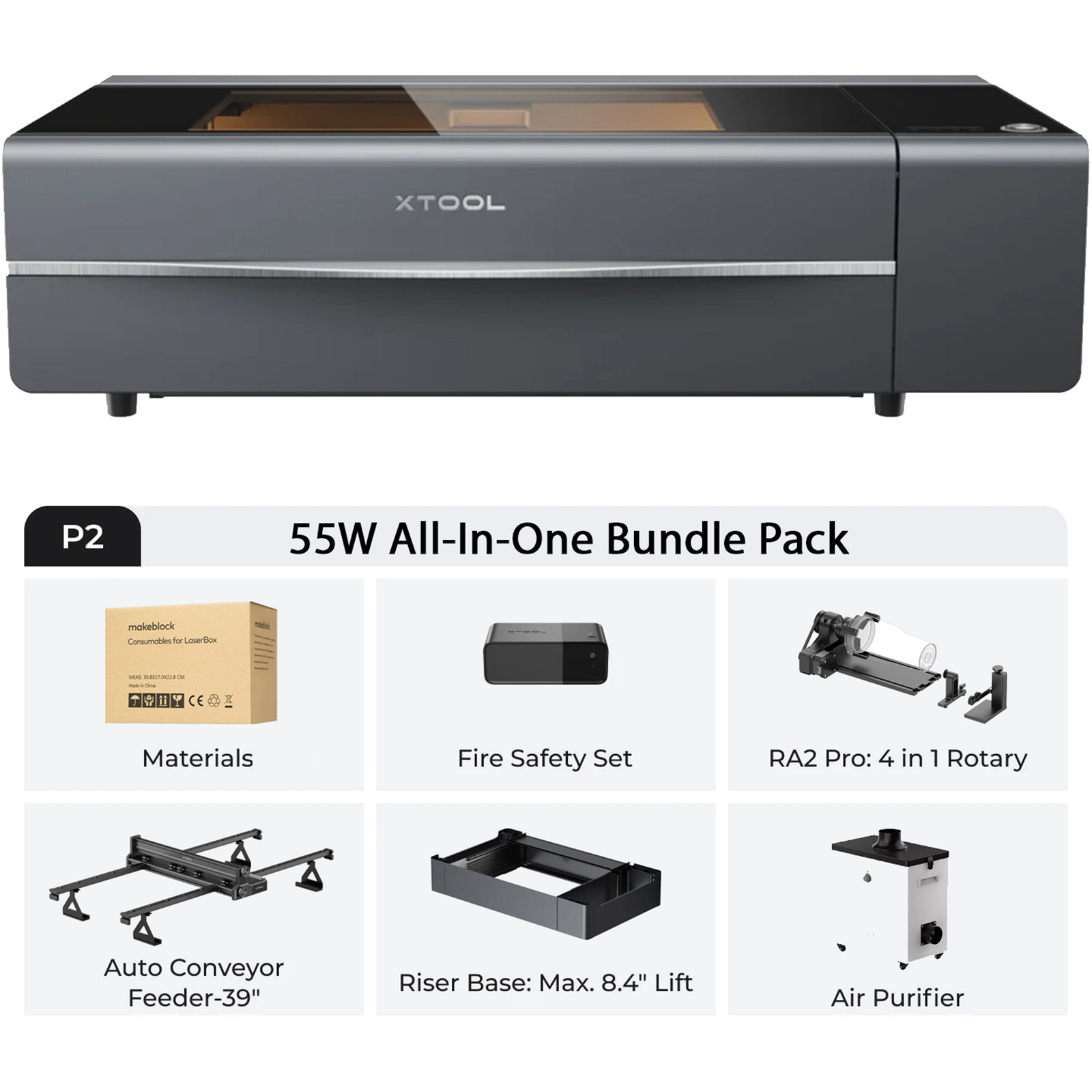 xTOOL Laser Engraver & Cutter P2 55W Desktop CO2 Grey, ClassIV All-In-One Bundle Pack Including Fire Safety Set, Riser Base, Automatic Conveyor Feeder Basic (39''), RA2 Pro, Smoke Purifier, FREE Materials (While Stock Last)