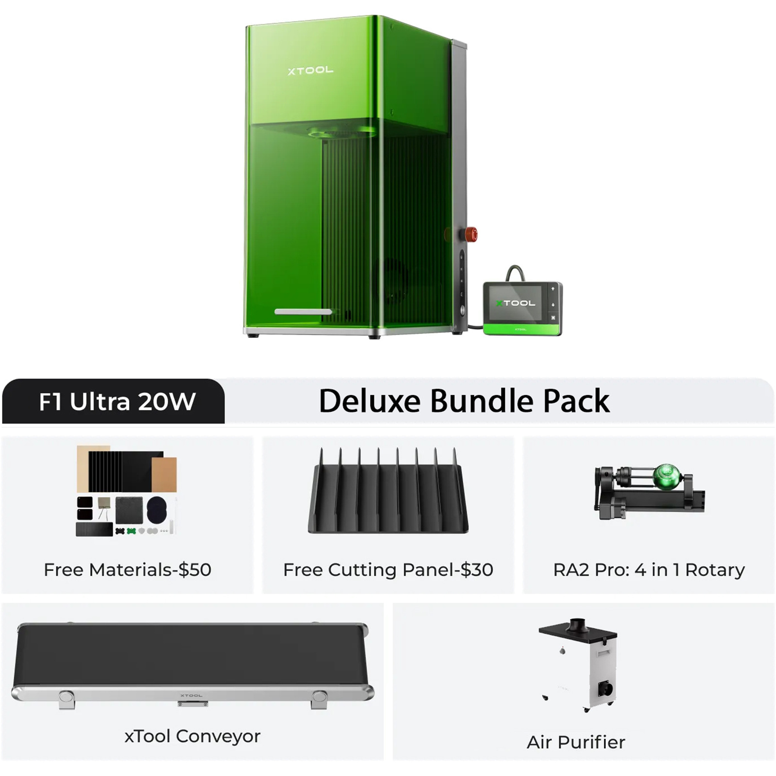 xTOOL Laser Engraver & Cutter F1 Ultra 20W Deluxe Bundle Pack - Mint Green With Smoke Purifier, Conveyor Belt, Rotary Attachment 2 Pro