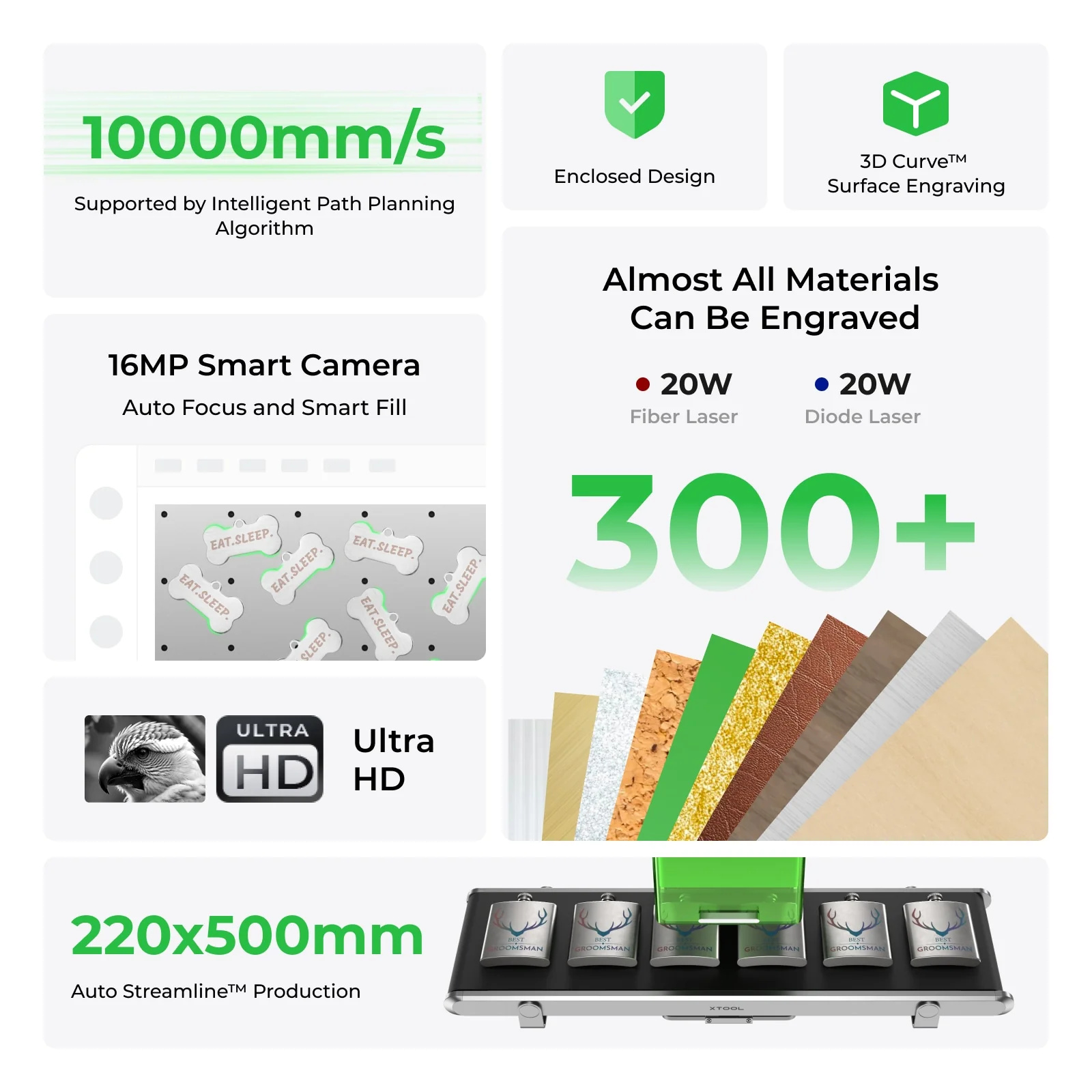 Most Efficient Batch Engraving on almost all materials: F1 Ultra has both 20W Fiber and 20W Diode Laser with its super speed 10000mm/s, 220*220mm engraving area and auto streamline™ production