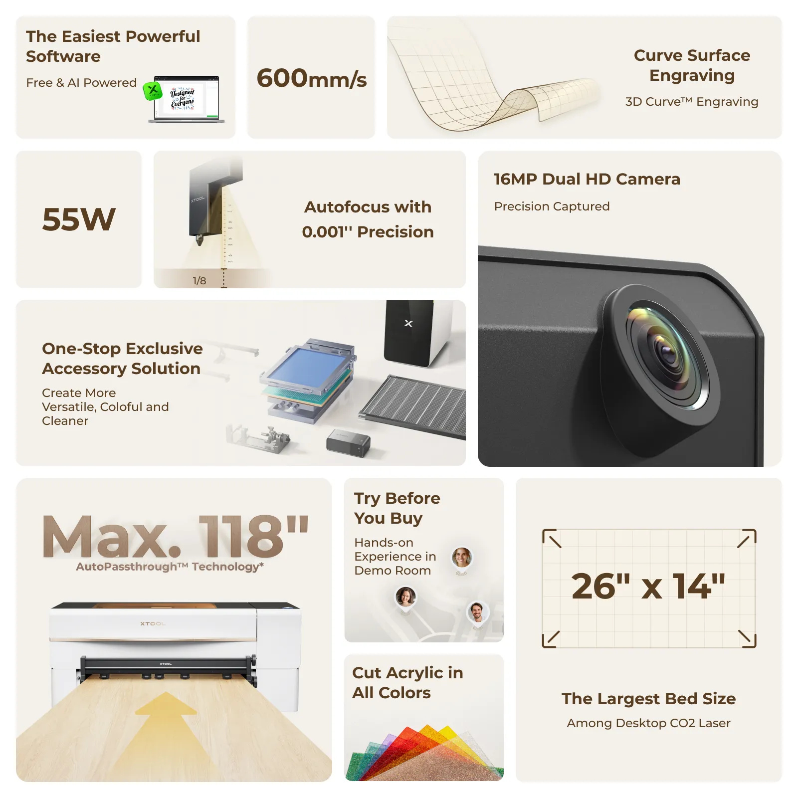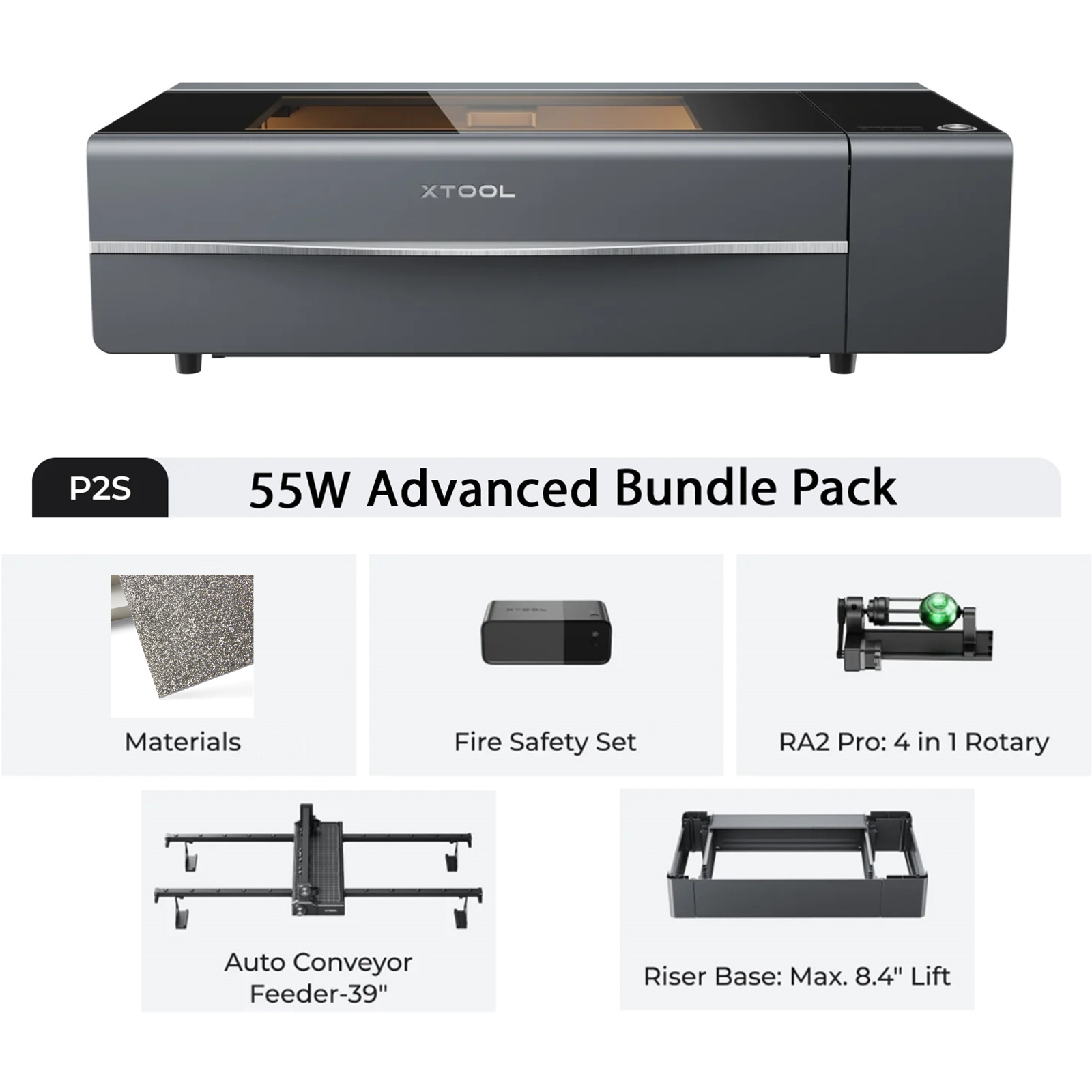 xTOOL Laser Engraver & Cutter P2S 55W Grey, ClassIV Advanced Bundle Pack Grey, Including Fire Safety Set, FREE Materials (While Stock Last), 4 in 1 Rotary, Riser Base, Auto Conveyor Feeder