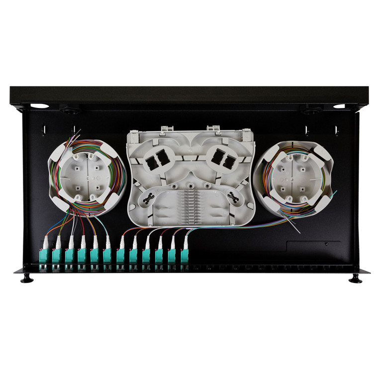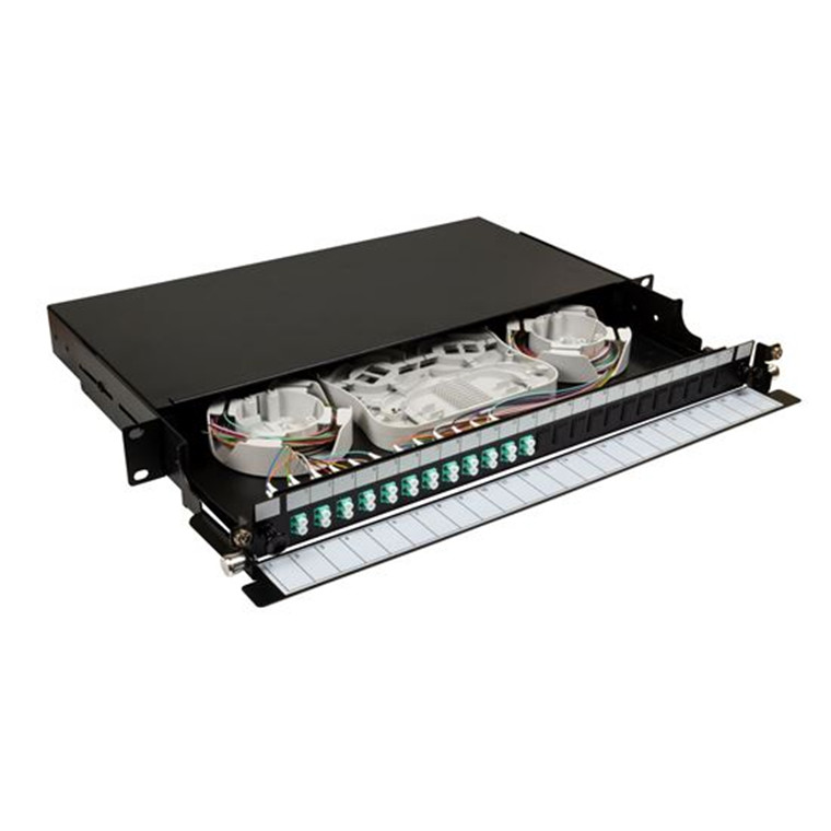 Dynamix FPP24SF-L124QO4 19 1U Fibre Tray 24C LC MM FULLY LOADED w 24x LC Elite OM4 Pigtails 12x LCDuplex Aqua Coupler Splice Cassette, Cable management Sliding Tray with front face Protection labelling Kit