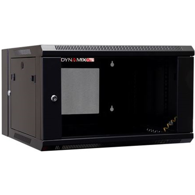 DYNAMIX LITE 6RU Swing Wall Mount Cabinet. Right hand mounted. The LITE version excludes fixed shelves, fans and reversable hinges. Includes 10 cage nuts. WxDxH(600x550x368) external.