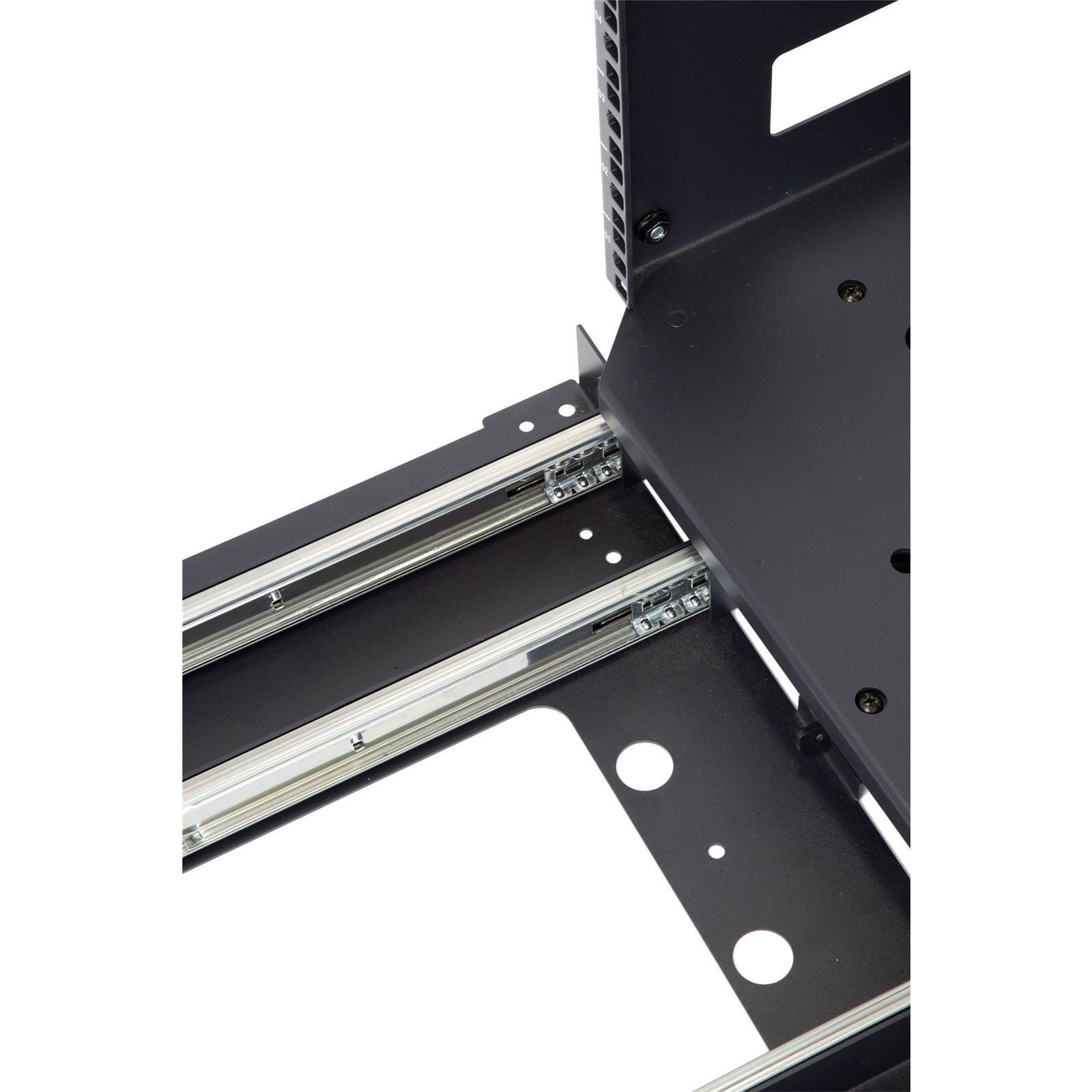 19" slide-out rotating equipment rack, ideal for in cupboard and in-cavity installations. The rack is fixed to the floor then slides out on integrated ball bearing base and can rotate 0, 60, 90 degrees in lockable positions for convenient equipment servicing.