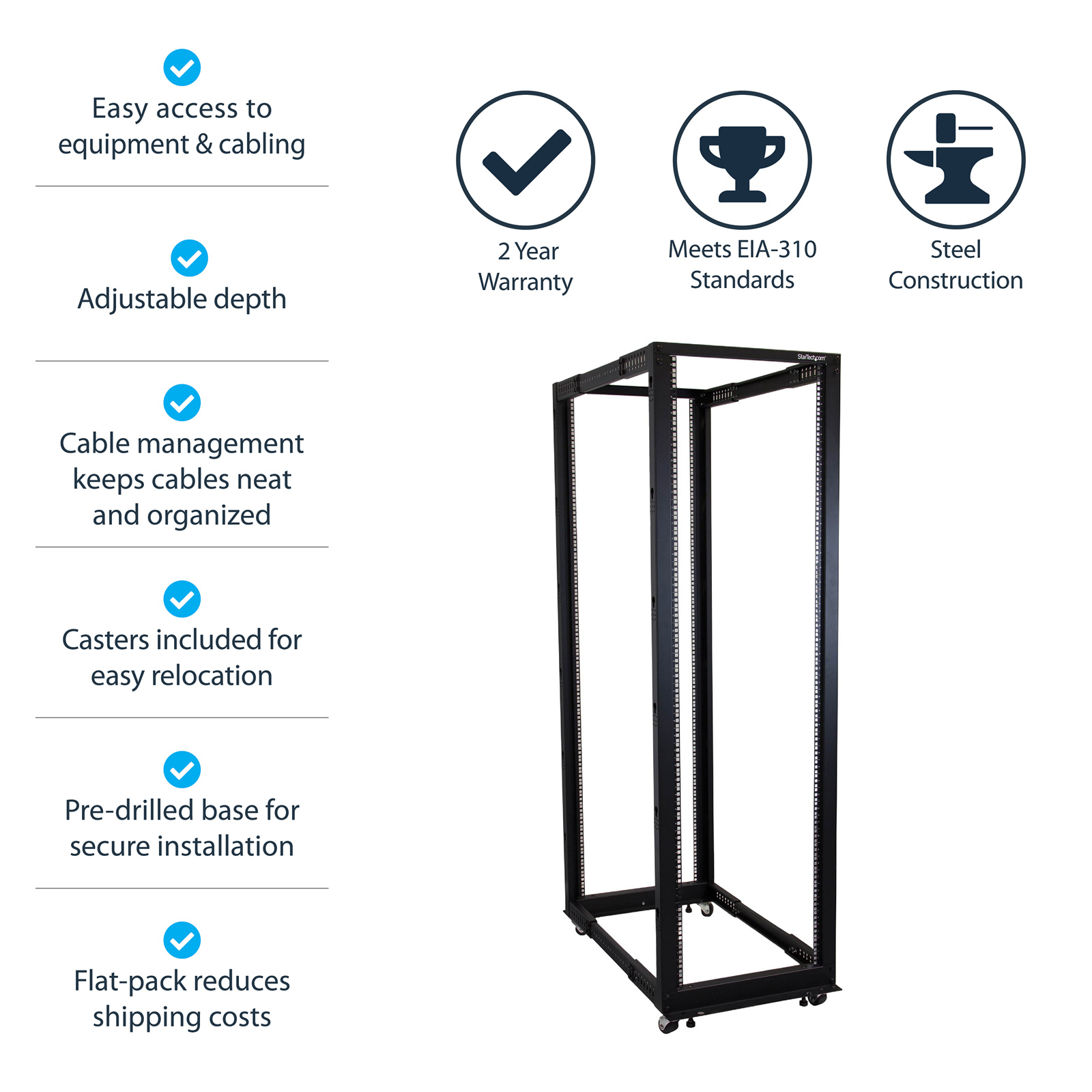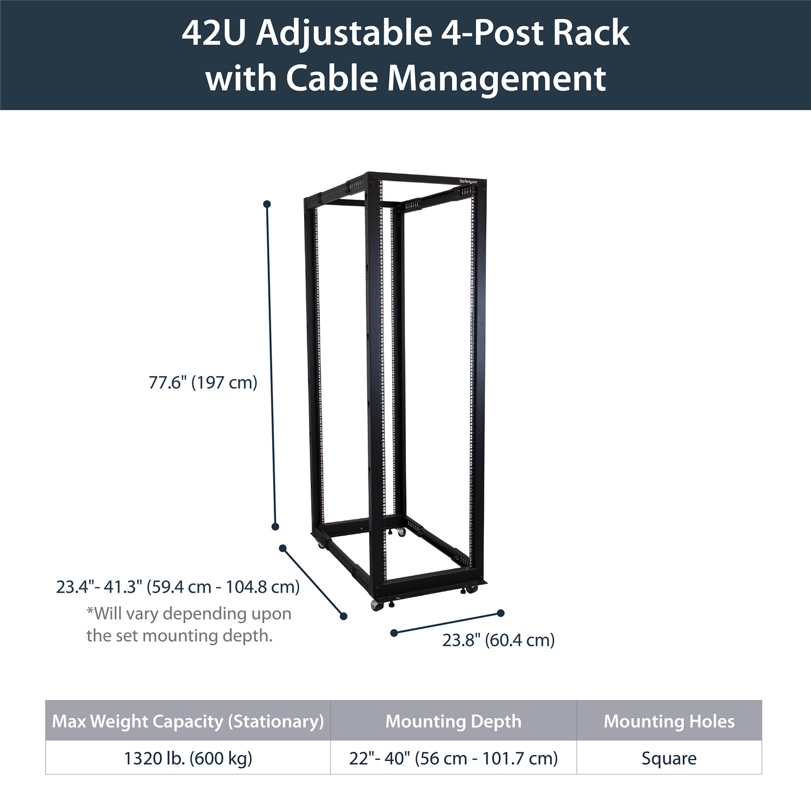 The 4POSTRACK42 42U Server Rack lets you store your servers, network and telecommunications equipment in a sturdy, adjustable depth open-frame rack. Designed with ease of use in mind, this 42U rack offers easy-to-read markings for both rack units (U) and depth, with a wide range of mounting depth adjustments (22 - 40in) that make it easy to adapt the rack to fit your equipment. This durable 4-post rack supports a static loading capacity of up to 1320lbs (600kg), and offers compliance with several industry rack standards (EIA/ECA-310, IEC 60297, DIN 41494) for a universal design that's compatible with most rack equipment. For a complete rack solution that saves you time and hassle, the rack includes optional accessories such as casters, leveling feet and cable management hooks. The base is also pre-drilled for securing the rack to the floor if needed, providing you with many options to customize the rack to fit your environment. Backed by a StarTech.com 2-year warranty and free lifetime technical support.