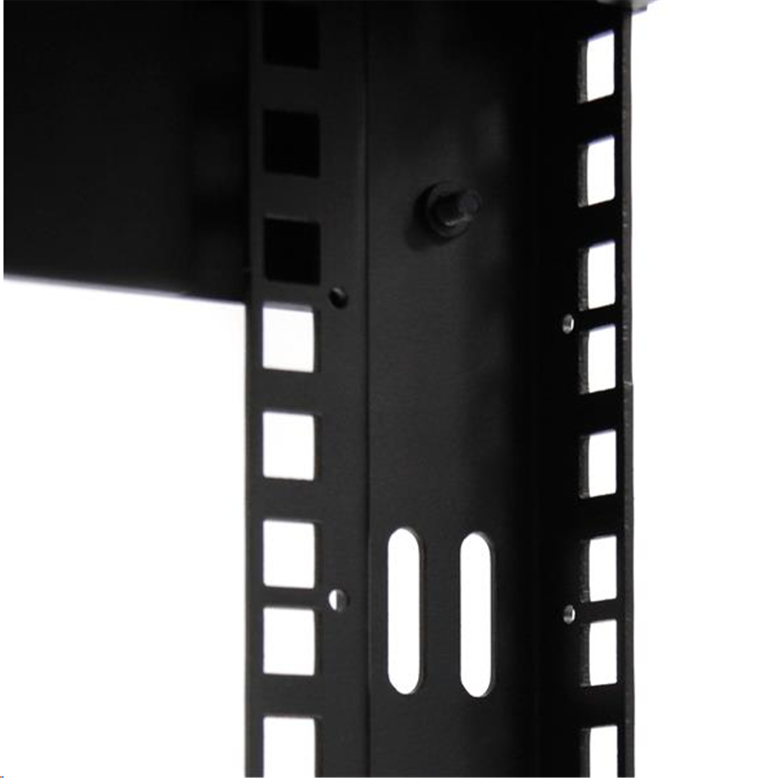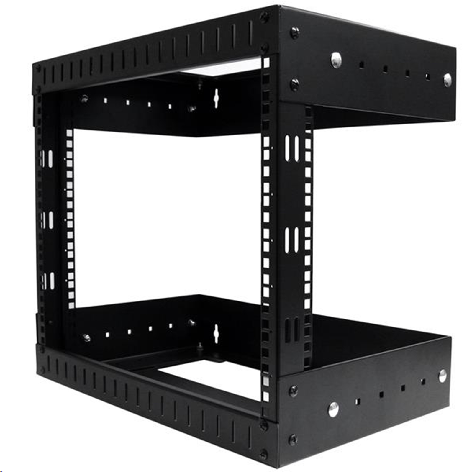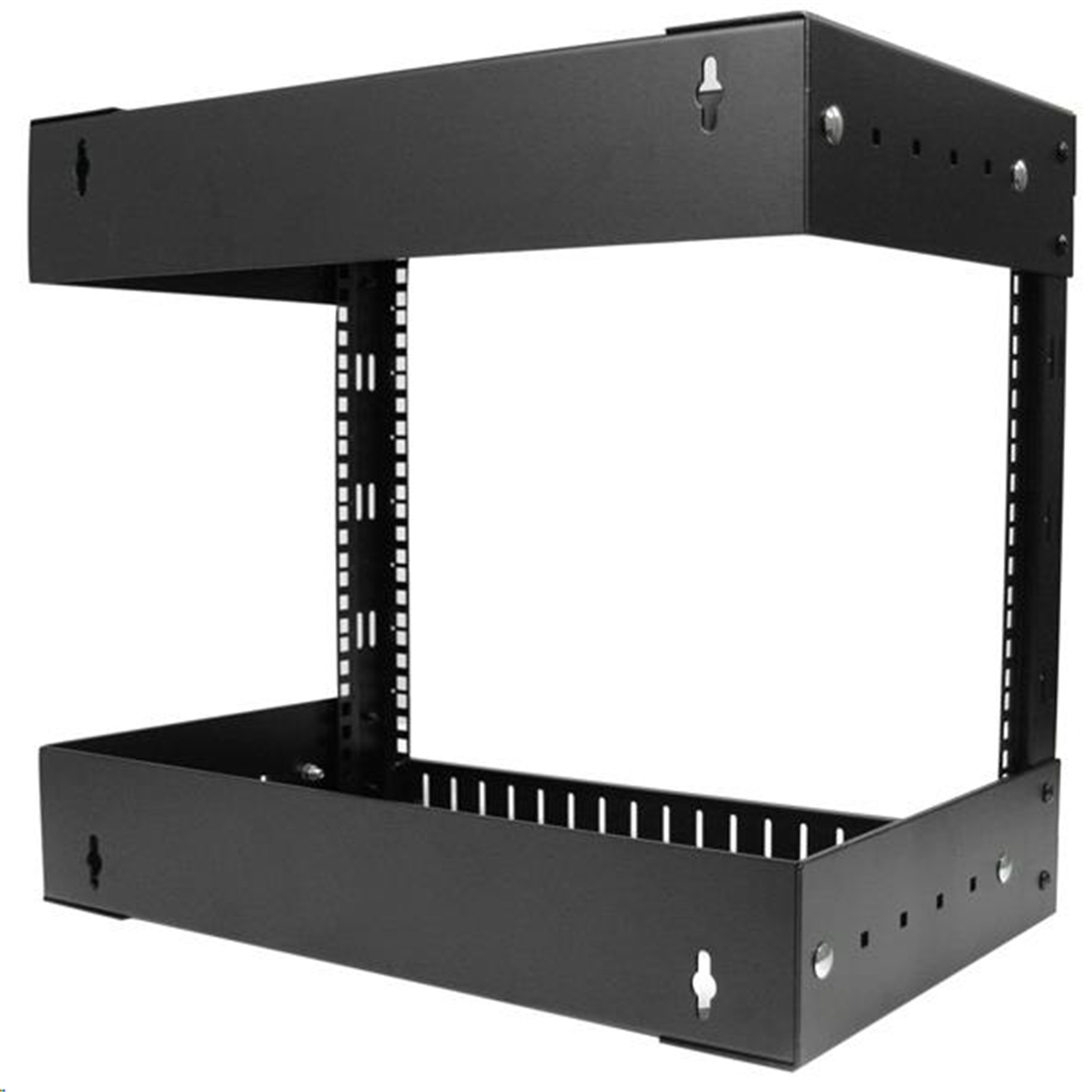 The RK812WALLOA 8U Open Frame Wall Mount Equipment Rack with Adjustable Depth is a high-quality, sturdy relay rack solution that is easy to assemble and install into any environment. This TAA compliant product adheres to the requirements of the US Federal Trade Agreements Act (TAA), allowing government GSA Schedule purchases. The open rack features an adjustable depth ranging from 12-20 inches, in order to accommodate larger data, network and telecommunications devices. The greater than average depth of the rack also allows for mounting of shelves and other accessories. The wall mounts are positioned 16in apart (center to center), making it suitable for mounting on virtually any wall surface, based on North American wall frame stud spacing standards. This 8U rack can be mounted to the wall in a server room, office, or above a doorway, expanding your workspace and keeping your equipment easily accessible.