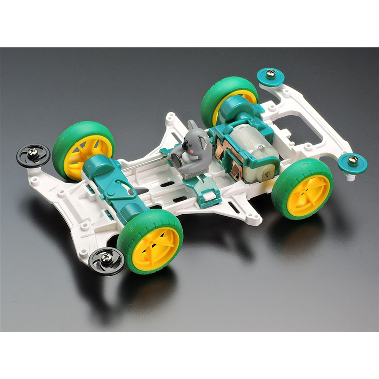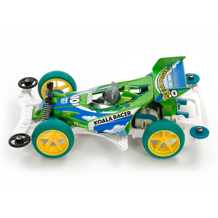 G'day Mini 4WD fans! This assembly kit creates the Koala Racer, a fun car with open top body and finished Koala Racer figure ready for attachment. Australia-esque themes are on display, with the wedge-shaped body molded in yellow-green ABS, and stickers included in the kit to create colorful decorations including images of a blue sky. The VS chassis and other parts are given complementary color schemes to round off the look.