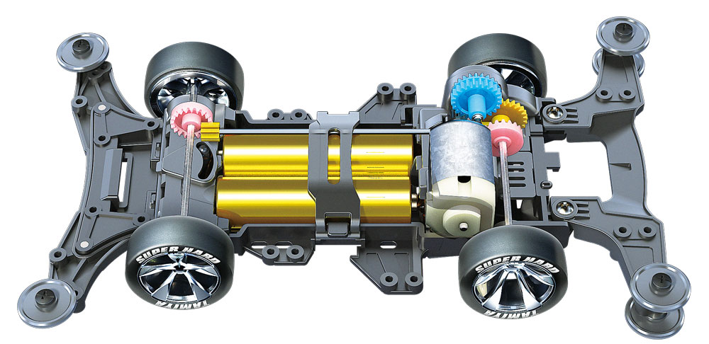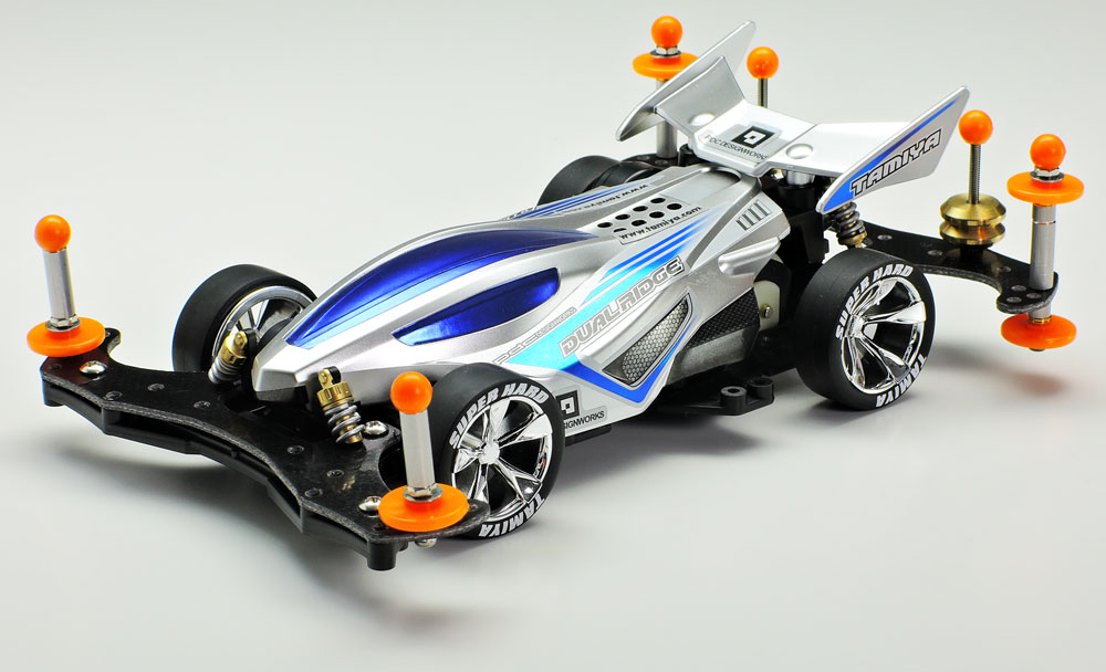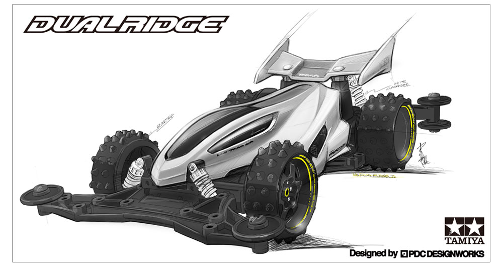 This assembly kit creates the Dual Ridge Jr., a Mini 4WD car that serves as a younger sibling to the famous Tamiya R/C car designed by Takayuki Yamazaki. Yamazaki was involved in the design of this product too, and it has the trademark bulging cockpit and oversized rear wing. Eight small holes have been integrated into the roof to help funnel air in for cooling purposes. It runs on the VZ chassis, a compact and versatile unit that will mean your little Dual Ridge Jr. is the talk of the racetrack - wherever you race!