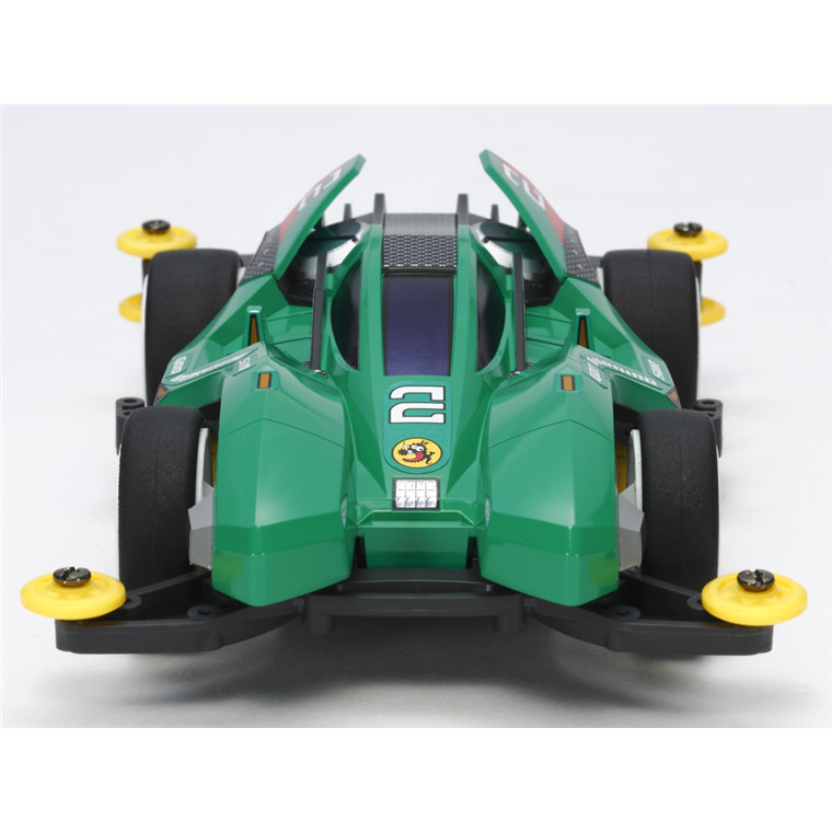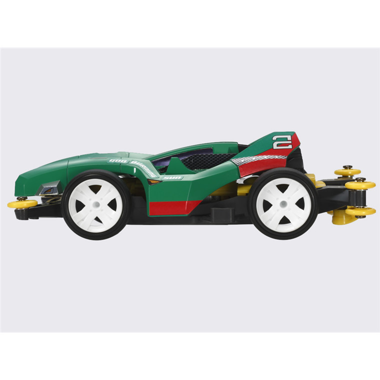 This Mini 4WD racer assembly kit creates an exciting new machine called the God Burning Sun, which appears in the Japanese Mini 4WD cartoon "Hyper Dash! Yonkuro" featuring in the comic Coro Coro Aniki. Its driver in the cartoon is Tankuro, buddy of the protagonist Hinomaru Yonkuro. The striking green body takes design cues from the powerful form of the original Burning Sun, melding them with jutting left and right fenders flanking the pulled-in nose. Separate parts are used to recreated the inward-sloping rear winglets. The profile view of the car (see detailed pictures below!) shows just how low to the ground it is, and the bullet-esque form promises competitive aerodynamics, which are enhanced by the modern MA chassis. White 4-spoke wheels with black slicks complete the look, and the model comes with a 4:1 gear ratio plus A parts molded in yellow.