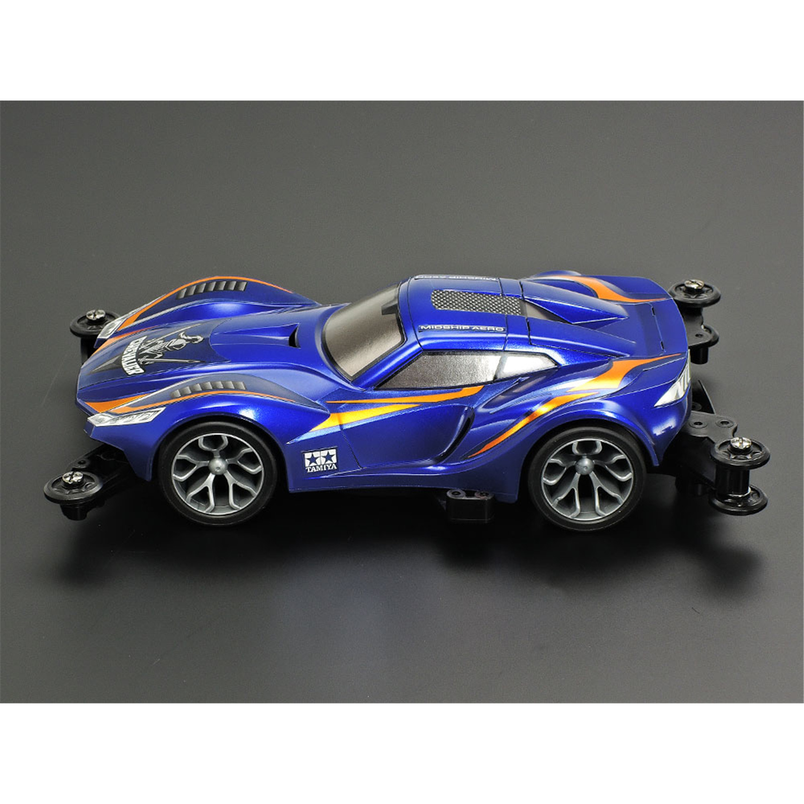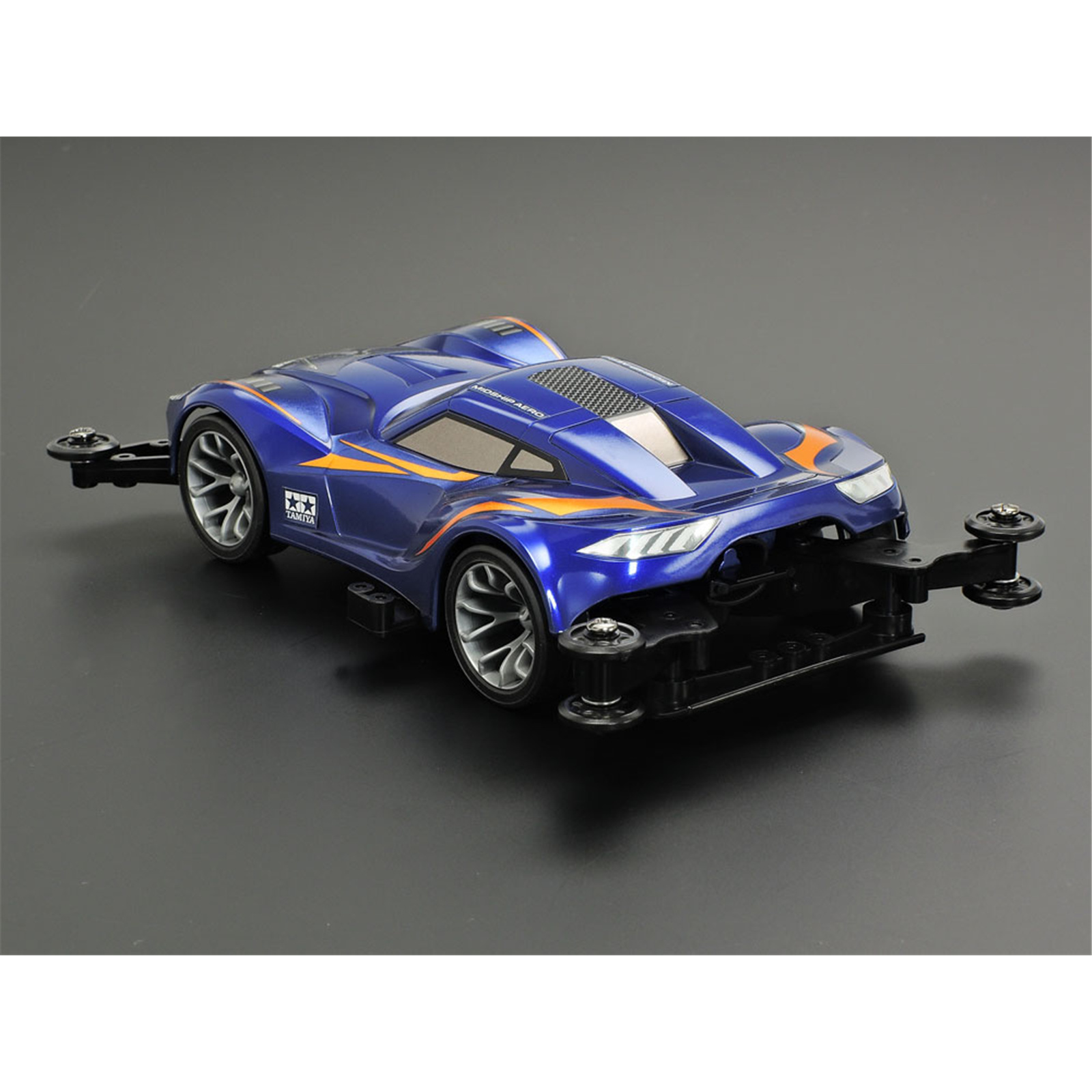 This assembly kit creates the Chevalier, a high performance Mini 4WD racer with a streamlined, wide body with prominent front fenders that just looks ready to race. It is based upon the MA chassis, paired with silver color Y-spoke wheels and small-diameter low-profile tires, plus metallic stickers included in the box to decorate the dark blue body, rooftop carbon fiber section and more.