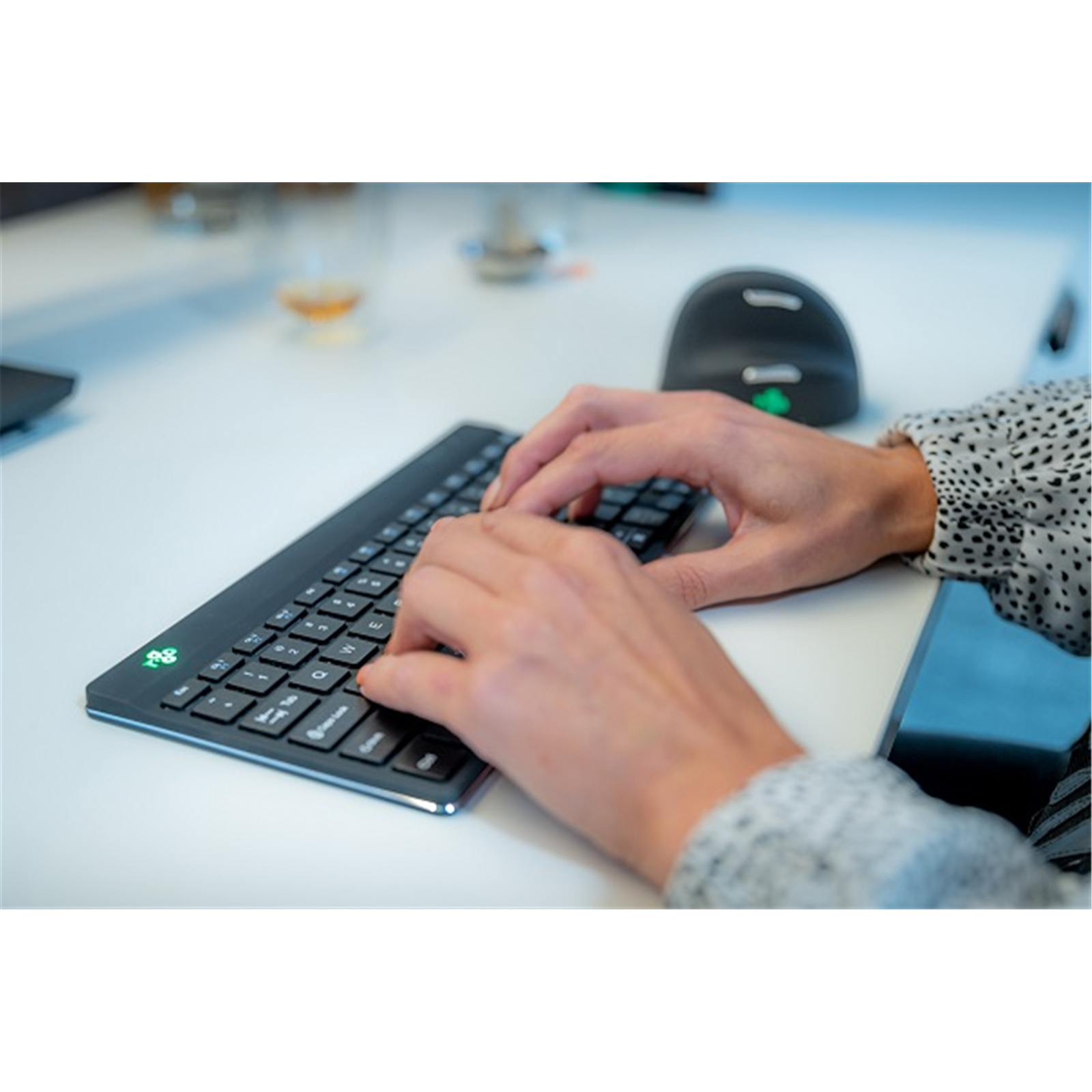 The keyboard is thin and has a light keystroke, which creates a flat position for the wrists and reduces muscle tension. You can easily carry the Ergo Compact Keyboard around, making it ideal for the new flexible way of working.