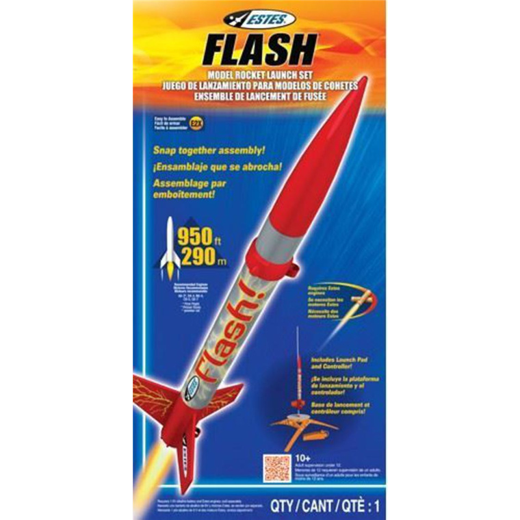 Ease of assembly is just one of the great features of this set. The main feature of the Flash is the sleek, drag defying design that provides high performance, cloud punching flights over 1100 feet on standard Estes engines. Each Flash Launch Set comes complete with a wicked looking Flash snap together model rocket kit and our super reliable Estes Launch Pad and Launch Controller.